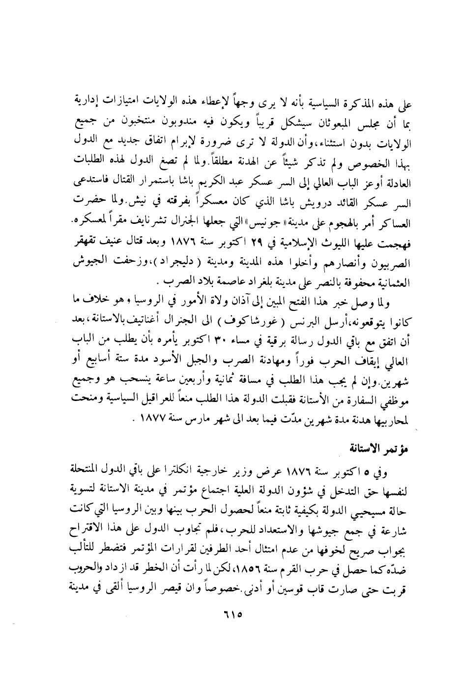 على هَذِه المذكرة السياسية بانه لَا يرى وَجها لاعطاء هَذِه الولايات امتيازات ادارية بِمَا ان مجْلِس المبعوثان سيشكل قَرِيبا وَيكون فِيهِ مندوبون منتخبون من جَمِيع الولايات بِدُونِ اسْتثِْنَاء وان الدولة لَا ترى ضَرُورَة لابرام اتِّفَاق جَدِيد مَعَ الدول لهَذَا الْخُصُوص وَلم تذكر شَيْئا عَن الْهُدْنَة مُطلقًا وَلما لم تصغ الدول لهَذِهِ الطلبات العادلة اوعز الْبَاب العالي إِلَى السِّرّ عَسْكَر عبد الْكَرِيم باشا باستمرار الْقِتَال فاستدعى السِّرّ عَسْكَر الْقَائِد درويش باشا الَّذِي كَانَ معسكرا بفرقته فِي نيش وَلما حضرت العساكر على مَدِينَة جونيس الَّتِي جعلهَا الجنرال تشرنايف مقرا لمعسكره فهجمت عَلَيْهَا الليوث الاسلامية فِي 29 اكتوبر سنة 1876 وَبعد قتال عنيف تقهقر الصربيون وانصارهم واخلوا هَذِه الْمَدِينَة ومدينة دليجراد وزحفت الجيوش العثمانية محفوفة بالنصر على مَدِينَة بلغراد عَاصِمَة بِلَاد الصرب
