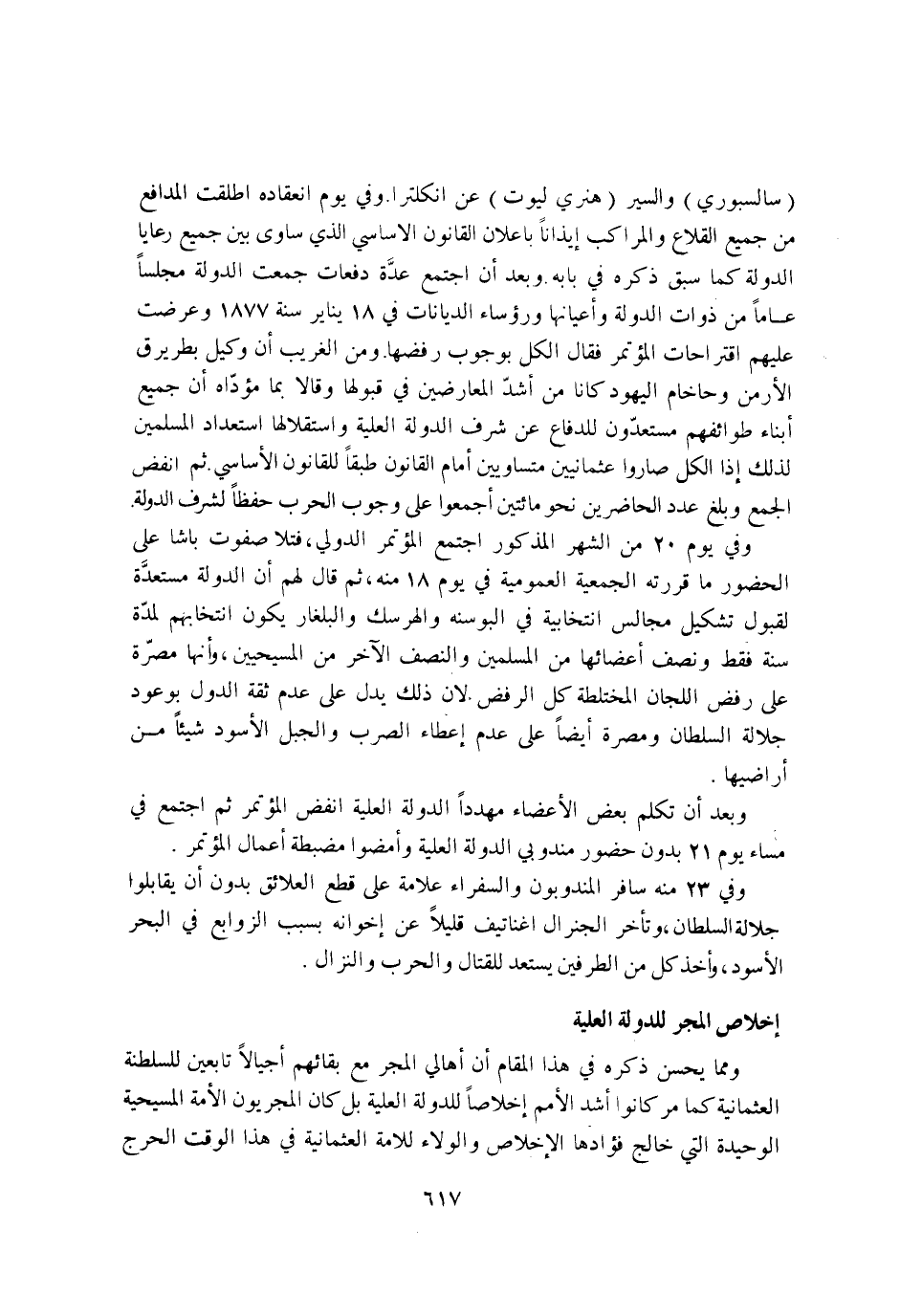 سالسبوري وَالسير هنري ليوت عَن انكلترا وَفِي يَوْم انْعِقَاده اطلقت المدافع من جَمِيع القلاع والمراكب ايذانا باعلان القانون الاساسي الَّذِي سَاوَى بَين جَمِيع رعايا الدولة كَمَا سبق ذكره فِي بَابه وَبعد ان اجْتمع عدَّة دفعات جمعت الدولة مَجْلِسا عَاما من ذَوَات الدولة واعيانها ورؤساء الديانَات فِي 18 يناير سنة 1877 وَعرضت عَلَيْهِم اقتراحات المؤتمر فَقَالَ الْكل بِوُجُوب رفضها وَمن الْغَرِيب ان وَكيل بطريرق والارمن وحاخام الْيَهُود كَانَا من اشد المعارضين فِي قبُولهَا وَقَالا بِمَا مؤداه ان جَمِيع ابناء طوائفهم مستعدون للدفاع عَن شرف الدولة الْعلية واستقلالها استعداد الْمُسلمين لذَلِك إِذا الْكل صَارُوا عثمانيين متساويين امام القانون طبقًا للقانون الاساسي ثمَّ انفض الْجمع وَبلغ عدد الْحَاضِرين نَحْو مِائَتَيْنِ اجْمَعُوا على وجوب الْحَرْب حفظا لشرف الدولة