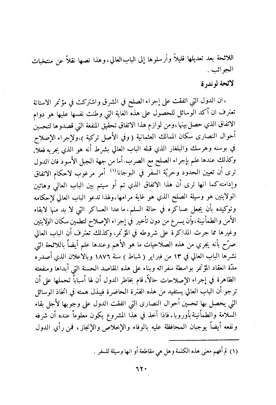 ان الدول الَّتِي اتّفقت على اجراء الصُّلْح فِي الشرق واشتركت فِي مؤتمر الاستانة تعترف ان آكِد الْوَسَائِل للحصول على هَذِه الْغَايَة الَّتِي وطنت نَفسهَا عَلَيْهَا هُوَ دوَام الِاتِّفَاق الَّذِي حصل بَينهَا وَمن لَوَازِم هَذَا الِاتِّفَاق تَحْقِيق الْمَنْفَعَة الَّتِي قصدوها لتحسين احوال النَّصَارَى سكان الممالك العثمانية وَفِي الاصل تركية ولاجراء الاصلاح فِي بوسنه وهرسك والبلغار الَّذِي قبله الْبَاب العالي بِشَرْط انه هُوَ الَّذِي يجريه فعلا وَكَذَلِكَ عِنْدهَا علم باجراء الصُّلْح مَعَ الصرب اما من جِهَة الْجَبَل الاسود فان الدول ترى ان تعْيين الْحُدُود وحرية السّفر فِي البوجانا امْر مَرْغُوب لاحكام الِاتِّفَاق وادامته كَمَا انها ترى ان هَذَا الِاتِّفَاق الَّذِي تمّ اَوْ سيتم بَين الْبَاب العالي وَهَاتين الولايتين هُوَ وسلة الصُّلْح الَّذِي هُوَ غَايَة مرامها وَلِهَذَا تدعوا الْبَاب العالي لاحكامه وتوكيده بِأَن يَجْعَل عساكره فِي حَالَة السّلم ماعدا العساكر الَّتِي لَا بُد مِنْهَا لابقاء الامن والطمأنينة وان يسْرع من دون تَأْخِير فِي اجراء الاصلاح لتطمين سكان الولايتين وَغَيرهَا مِمَّا جرت المذاكرة على شُرُوطه فِي المؤتمر وَكَذَلِكَ تعترف ان الْبَاب العالي صرح بانه يجْرِي من هَذِه الصلاحيات مَا هُوَ الاهم وَعِنْدهَا علم ايضا باللائحة الَّتِي نشرها الْبَاب العالي فِي 13 من فبراير شباط سنة 1876 وبالاعلان الَّذِي اصدره مُدَّة انْعِقَاد المؤتمر بِوَاسِطَة سفراءه وَبِنَاء عل هَذِه الْمَقَاصِد الْحَسَنَة الَّتِي ابداها ومنفعته الظَّاهِرَة فِي اجراء الاصلاحات حَالا قَامَ بخاطر الدول ان لَهَا اسبابا تحملهَا على ان ترجو ان الْبَاب العالي يَسْتَفِيد من هَذِه الفترة الْحَاضِرَة فيبذل همته فِي اتِّخَاذ الْوَسَائِل الَّتِي يحصل بهَا تَحْسِين احوال النَّصَارَى الَّتِي اتّفقت الدول على وُجُوبهَا لاجل بَقَاء السَّلامَة والطمأنينة باوروبا فاذا اخذ فِي هَذَا الْمَشْرُوع يكون مَعْلُوما عِنْده ان شرفه ونفعه ايضا يوجبان الْمُحَافظَة عَلَيْهِ بِالْوَفَاءِ والاخلاص والانجاز فَمن رَأْي الدول