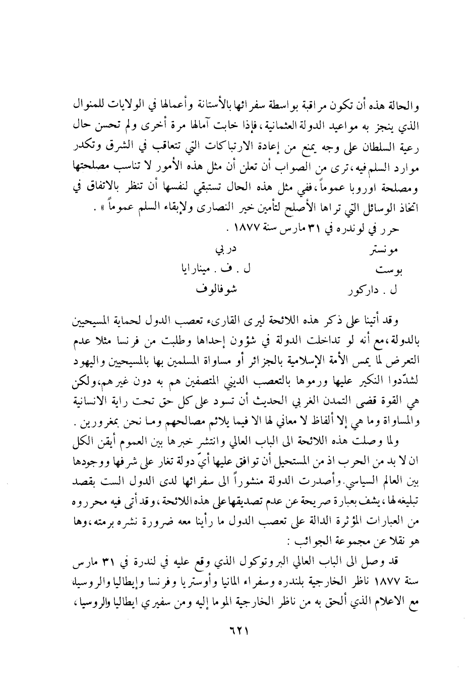 وَقد وصل إِلَى الْبَاب العالي البروتوكول الَّذِي وَقع عَلَيْهِ فِي لندرة فِي 31 مارس سنة 1877 نَاظر الخارجية بلندره وسفراء المانيا واوستريا وفرنسا وايطاليا والروسيا مَعَ الاعلام الَّذِي الْحق بِهِ من نَاظر الخارجية الموما اليه وَمن سفيري ايطاليا والروسيا