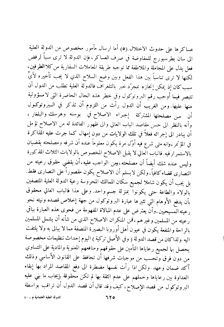 عساكرها على حُدُوث الاختلال اما ارسال مامور مَخْصُوص من الدولة الْعلية إِلَى سان بطرسبورج للمفاوضة فِي صرف العساكر فان الدولة لَا ترى سَببا لرفض فعل يدل على المجاملة والملاطفة مِمَّا توجبه طَريقَة الْمُعَامَلَات السفارية من كلا الطَّرفَيْنِ لَكِنَّهَا لَا ترى تنَاسبا بَين هَذَا الْفِعْل وَبَين وضع السِّلَاح الَّذِي لَا يجب تَأْخِيره لأي سَبَب كَانَ اذ يُمكن انجازه بِمُجَرَّد خبر بالتلغراف فالدولة الْعلية تطلب من الدول ان تتبصر فِيمَا اوجب رقم البروتوكول وَفِي خطر هَذِه الْحَال الْحَاضِرَة الت يلا مسؤولية مِنْهَا عَلَيْهَا وَمن الْغَرِيب ان الدول رَأَتْ من اللُّزُوم ان تذكر فِي البروتوكول ان من مصلحتها الْمُشْتَركَة اجراء الاصلاح فِي بوسنه وهرسك والبلغار وانه بِالنّظرِ إِلَى حسن مَقَاصِد الْبَاب العالي وَإِلَى ظُهُور الْفَائِدَة لَهُ من الاصلاح تؤمل ان يُبَادر إِلَى اجرائه فعلا فِي تِلْكَ الولايات من دون امهال كَمَا جرت عَلَيْهِ المذاكرة فِي المؤتمر وانه مَتى شرع فِيهِ اول مرّة يكون مَعْلُوما عِنْده ان شرفه ومصلحته يقضيان بالاستمرار فِيهِ فالباب العالي لَا يقبل الاصلاح الْمَخْصُوص بالولايات الثَّلَاث الْمَذْكُورَة وَلَيْسَ عِنْده شكّ ايضا ان مصْلحَته وَمن الْوَاجِب عَلَيْهِ ان يقْضِي حُقُوق رَعيته من النَّصَارَى قَضَاء كَافِيا وَلَكِن لَا يسلم ان الاصلاح يكون مَقْصُورا على النَّصَارَى فَقَط بل يجب ان يكون شَامِلًا لجَمِيع سكان الممالك المحروسة رعية الدولة الْعلية المتصفين بِالْوَلَاءِ وَالطَّاعَة حَتَّى يَكُونُوا بِمَنْزِلَة جسم وَاحِد وعَلى هَذَا فالباب العالي محقوق بَان يدْفع الاوهام الَّتِي تثيرها عبارَة البروتوكول من جِهَة اخلاص قَصده وَنِيَّته نَحْو رَعيته المسيحيين وان يعْتَرض على عدم المبالاة المفهومة من فحوى هَذِه الْعبارَة بباقي رَعيته من الْمُسلمين وَغَيرهم فَمن المنكران الاصلاح الَّذِي من شَأْنه ان يَشْمَل الْمُسلمين بالراحة وَالْمَنْفَعَة يكون فِي عُيُون اهل اوروبا البصيرة المنصفة مِمَّا لَا يبالى بِهِ وَلَا يلْتَفت اليه وَلذَا كَانَ من قصد الدولة وَفِي الاصل تركية الْيَوْم احداث تنظيمات مَخْصُوصَة يحصل بهَا لجَمِيع رعاياها التَّأْمِين على حُقُوقهم ومنافعهم المعنوية والمادية على التَّسَاوِي من دون فرق وتحسب من مُوجبَات شرفهاان تحافظ على القانون الاساسي وَذَلِكَ آكِد ضَمَان وعهد وَلَكِن إِذا رَأَتْ نَفسهَا مضطرة إِلَى دفع الْمَقَاصِد المُرَاد بهَا ابقاء الْعَدَاوَة بَين رعاياها وَحَملهمْ على عدم الثِّقَة بهَا لم تكن محقوقة بايجاب مَا بني عَلَيْهِ البروتوكول من قصد الاصلاح كَيفَ وَقد قَالَ ان قصد الدول ان تراقب بِوَاسِطَة