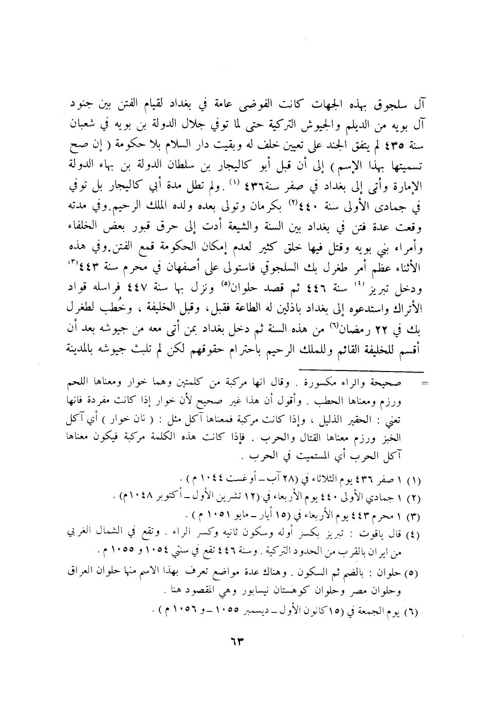 آل سلجوق بِهَذِهِ الْجِهَات كَانَت الفوضى عَامَّة فِي بَغْدَاد لقِيَام الْفِتَن بَين جنود آل بويه من الديلم والجيوش التركية حَتَّى لما توفّي جلال الدولة بن بويه فِي شعْبَان سنة 435 لم يتَّفق الْجند على تعْيين خلف لَهُ وَبقيت دَار السَّلَام بِلَا حُكُومَة ان صَحَّ تَسْمِيَتهَا بِهَذَا الِاسْم إِلَى ان قبل ابو كاليجار بن سُلْطَان الدولة بن بهاء الدولة الامارة واتى إِلَى بَغْدَاد فِي صفر سنة 436 وَلم تطل مُدَّة ابي كاليجار بل توفّي فِي جُمَادَى الاولى سنة 440 بكرمان وَتَوَلَّى بعده وَلَده الْملك الرَّحِيم وَفِي مدَّته وَقعت عدَّة فتن فِي بَغْدَاد بَين السّنة والشيعة ادت إِلَى حرق قُبُور بعض الْخُلَفَاء وامراء بني بويه وَقتل فِيهَا خلق كثير لعدم امكان الْحُكُومَة قمع الْفِتَن وَفِي هَذِه الاثناء عظم امْر طغرل بك السلجوقي فاستولى على اصفهان فِي محرم سنة 443 وَدخل تبريز سنة 446 ثمَّ قصد حلوان وَنزل بهَا سنة 447 فراسله قواد الاتراك واستدعوه إِلَى بَغْدَاد باذلين لَهُ الطَّاعَة فَقبل وَقبل الْخَلِيفَة وخطب لطغرل بك فِي 22 رَمَضَان من هَذِه السّنة ثمَّ دخل بَغْدَاد بِمن اتى مَعَه من جيوشه بعد ان اقْسمْ للخليفة الْقَائِم وللملك الرَّحِيم باحترام حُقُوقهم لَكِن لم تلبث جيوشه بِالْمَدِينَةِ