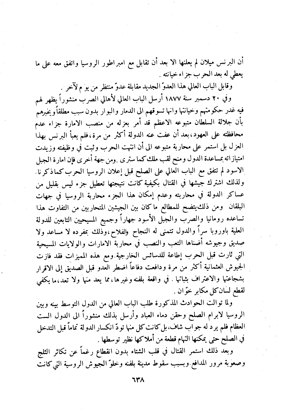 وَفِي 20 دسمبر سنة 1877 ارسل الْبَاب العالي لاهالي الصرب منشورا يظْهر لَهُم فِيهِ غدر حكومتهم وخيانتها وانها تسوقهم إِلَى الدمار والبوار بِدُونِ سَبَب مُطلقًا ويخبرهم بَان جلالة السُّلْطَان متبوعه الاعظم قد امْر بعزله من منصب الامارة جَزَاء عدم محافظته على العهود بعد ان عفت عَنهُ الدولة اكثر من مرّة فَلم يعبأ الْبُرْنُس بِهَذَا الْعَزْل بل اسْتمرّ على محاربة متبوعه إِلَى ان انْتَهَت الْحَرْب وَثَبت فِي وظيفته وزيدت امتيازاته بمساعدة الدول ومنح لقب ملك كَمَا سترى وَمن جِهَة اخرى فان امارة الْجَبَل الاسود لم تتفق مَعَ الْبَاب العالي على الصُّلْح قبل اعلان الروسيا الْحَرْب كَمَا ذكرنَا وَلذَلِك اشْترك جيشها فِي الْقِتَال بكيفية كَانَت نتيجتها تَعْطِيل جُزْء لَيْسَ بِقَلِيل من عَسَاكِر الدولة فِي محاربته وَعدم امكان هَذَا الْجُزْء محاربة الروسيا فِي جِهَات البلقان وَمن ذَلِك يَتَّضِح للمطالع مَا كَانَ بَين الجيشين المتحاربين من التَّفَاوُت هَذَا تساعده رومانيا والصرب والجبل الاسود جهارا وَجَمِيع المسيحيين التَّابِعين للدولة الْعلية باوروبا سرا والدول تتمنى لَهُ النجاح والفلاح وَذَلِكَ بمفرده لَا مساعد وَلَا صديق وجيوشه اضناها التَّعَب وَالنّصب فِي محاربة الامارات والولايات المسيحية الَّتِي ثارت قبل الْحَرْب اطاعة للدسائس الخارجية وَمَعَ هَذِه المميزات فقد فازت الجيوش العثمانية اكثر من مرّة ودافعت دفاعا اضْطر الْعَدو قبل الصّديق إِلَى الاقرار بشجاعتها وَالِاعْتِرَاف بثباتها فِي وَاقعَة بلفنه وَغَيرهَا مِمَّا يعد مِنْهَا وَلَا تعد مَا يَكْفِي لقطع لِسَان كل مكابر خوان