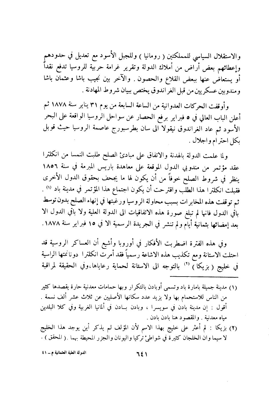 واوقفت الحركات العدوانية من السَّاعَة السَّابِعَة من يَوْم 31 يناير سنة 1878 ثمَّ أعلن الْبَاب العالى فِي لَا 5 فبرا ير بِرَفْع الْحصار عَن سواحل الروسيا الْوَاقِعَة على الْبَحْر الْأسود ثمَّ عَاد الغراندوق نيوقولا الى سان بطر سبورج عَاصِمَة الروسيا حَيْثُ قوبيل بِكُل إحترام واجلال وَلما علمة الدولة بالهدنة والأتفاق على مبايء الصُّلْح طلبت النمسا من انكلترا عقد مؤتمر من مندوبي الدول الموقعة على معاهدة باريس المبرمة فِي سنة 1856 ينظر فِي شُرُوط الصُّلْح خوفًا من ان يكون لَهَا مَا يجحف بِحُقُوق الدول الاخرى فَقبلت انكلترا هَذَا الطّلب واقترحت ان يكون اجْتِمَاع هَذَا المؤتمر فِي مَدِينَة باد ثمَّ توقفت هَذِه المخابرات بِسَبَب محاولة الروسيا ورغبتها فِي انهاء الصُّلْح بِدُونِ توَسط بَاقِي الدول فانها لم تبلغ صُورَة هَذِه الاتفاقيات إِلَى الدولة الْعلية وَلَا بَاقِي الدول الا بعد امضائها بِثمَانِيَة ايام وَلم تنشر فِي الجريدة الرسمية الا فِي 15 فبراير سنة 1878