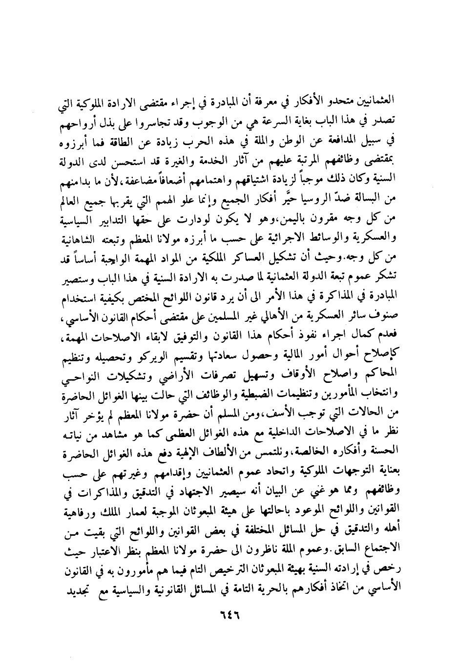 العثمانيين متحدو الافكار فِي معرفَة ان الْمُبَادرَة فِي اجراء مُقْتَضى الارادة الملوكية الَّتِي تصدر فِي هَذَا الْبَاب بغاية السرعة هِيَ من الْوُجُوب وَقد تجاسروا على بذل ارواحهم فِي سَبِيل المدافعة عَن الوطن وَالْملَّة فِي هَذِه الْحَرْب زِيَادَة عَن الطَّاقَة فَمَا ابرزوه بِمُقْتَضى وظائفهم الْمرتبَة عَلَيْهِم من آثَار الْخدمَة والغيرة قد اسْتحْسنَ لَدَى الدولة السّنيَّة وَكَانَ ذَلِك مُوجبا لزِيَادَة اشتياقهم واهتمامهم اضعافا مضاعفة لَان مَا بدا مِنْهُم من البسالة ضد الروسيا حير افكار الْجَمِيع وانما علو الهمم الَّتِي يقربهَا جَمِيع الْعَالم من كل وَجه مقرون بِالْيمن وَهُوَ لَا يكون لودارت على حَقّهَا التدابير السياسية والعسكرية والرسائط الاجرائية على حسب مَا ابرزه مَوْلَانَا الْمُعظم وتبعته الشاهانية من كل وَجه وَحَيْثُ ان تشكيل العساكر الملكية من الْموَاد المهمة الْوَاجِبَة اساسا قد تشكر عُمُوم تبعة الدولة العثمانية لما صدرت بِهِ الارادة السّنيَّة فِي هَذَا الْبَاب وستصير الْمُبَادرَة فِي المذاكرة فِي هَذَا الامر إِلَى ان يرد قانون اللوائح الْمُخْتَص بكيفية اسْتِخْدَام صنوف سَائِر العسكرية من الاهالي غير الْمُسلمين على مُقْتَضى احكام القانون الاساسي فَعدم كَمَال اجراء نفود احكام هَذَا القانون والتوفيق لابقاء الاصلاحات المهمة كاصلاح احوال امور الْمَالِيَّة وَحُصُول سعادتها وتقسيم الويركو وتحصيله وتنظيم المحاكم واصلاح الاوقاف وتسهيل تصرفاتا الاراضي وتشكيلات النواحي وانتخاب المامورين وتنظيمات الضبطية والوظائف الَّتِي حَالَتْ بَينهَا الغوائل الْحَاضِرَة من الْحَالَات الَّتِي توجب الاسف وَمن الْمُسلم ان حَضْرَة مَوْلَانَا الْمُعظم لم يُؤَخر آثَار نظر مَا فِي الاصلاحات الداخلية مَعَ هَذِه الغوائل الْعُظْمَى كَمَا هُوَ مشَاهد من نياته الْحَسَنَة وافكاره الْخَالِصَة ونلتمس من الالطاف الالهية دفع هَذِه الغوائل الْحَاضِرَة بعناية التوجهات الملوكية واتحاد عُمُوم العثمانيين واقدامهم وغيرتهم على حسب وظائفهم وَمِمَّا هُوَ عني عَن الْبَيَان انه سيصير الِاجْتِهَاد فِي التدقيق والمذاكرات فِي القوانين واللوائح الْمَوْعُود باحالتها على هَيْئَة المبعوثان الْمُوجبَة لعمَّار الْملك ورفاهية اهله والتدقيق فِي حل الْمسَائِل الْمُخْتَلفَة فِي بعض القوانين واللوائح الَّتِي بقيت من الِاجْتِمَاع السَّابِق وَعُمُوم الْملَّة ناظرون إِلَى حَضْرَة مَوْلَانَا الْمُعظم ينظر الِاعْتِبَار حَيْثُ رخص فِي ارادته السّنيَّة بهيئة المبعوثان الترخيص التَّام فِيمَا هم مامورون بِهِ فِي القانون الاساسي من اتِّخَاذ افكارهم بِالْحُرِّيَّةِ التَّامَّة فِي الْمسَائِل القانونية والسياسية مَعَ تَجْدِيد