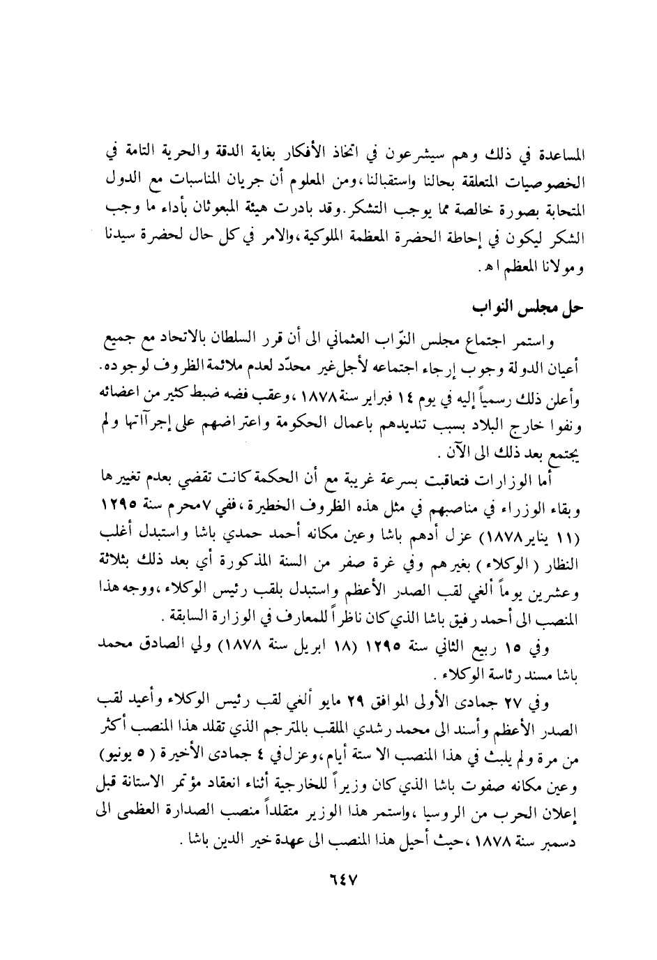 وَفِي 27 جُمَادَى الاولى الْمُوَافق 29 مايو الغي لقب رَئِيس الوكلاء واعيد لقب الصَّدْر الاعظم وَاسْنِدِ إِلَى مُحَمَّد رشدي الملقب بالمترجم الَّذِي تقلد هَذَا المنصب اكثر من مرّة وَلم يلبث فِي هَذَا المنصب الا سِتَّة ايام وعزل فِي 4 جُمَادَى الاخيرة 5 يونيو وَعين مَكَانَهُ صفوت باشا الَّذِي كَانَ وزيرا للخارجية اثناء انْعِقَاد مؤتمر الاستانة قبل اعلان الْحَرْب من الروسيا وَاسْتمرّ هَذَا الْوَزير مُتَقَلِّدًا منصب الصدارة الْعُظْمَى إِلَى دسمبر سنة 1878 حَيْثُ احيل هَذَا المنصب إِلَى عُهْدَة خير الدّين باشا