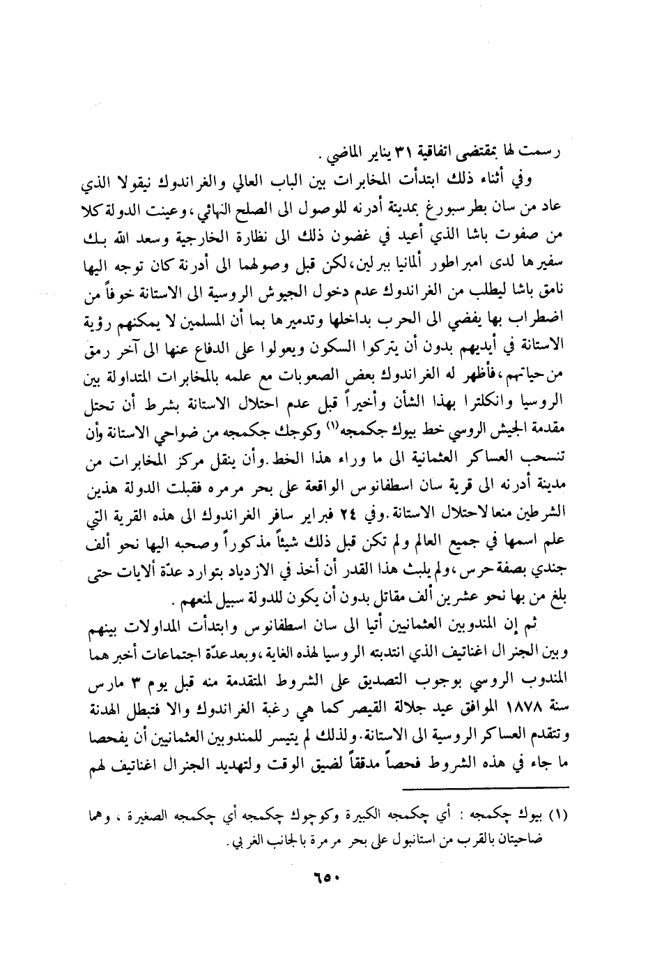 وَفِي اثناء ذَلِك ابتدأت المخابرات بَين الْبَاب العالي والغراندوك نيقولا الَّذِي عَاد من سان بطرسبورغ بِمَدِينَة ادرنه للوصول إِلَى الصُّلْح النهائي وعينت الدولة كلا من صفوت باشا الَّذِي اعيد فِي غُضُون ذَلِك إِلَى نظارة الخارجية وَسعد الله بك سفيرها لَدَى امبراطور المانيا ببرلين لَكِن قبل وصولهما إِلَى ادرنة كَانَ توجه اليها نامق باشا ليطلب من الغراندوك عدم دُخُول الجيوش الروسية إِلَى الاستانة خوفًا من اضْطِرَاب بهَا يقْضِي إِلَى الْحَرْب بداخلها وتدميرها بِمَا ان الْمُسلمين لَا يُمكنهُم رُؤْيَة الاستانة فِي ايديهم بِدُونِ ان يتْركُوا السّكُون ويعولوا على الدفاع عَنْهَا إِلَى آخر رَمق من حياتهم فاظهر لَهُ الغراندوك بعض الصعوبات مَعَ علمه بالمخابرات المتداولة بَين الروسيا وانكلترا بِهَذَا الشَّأْن واخيرا قبل عدم احتلال الاستانة بِشَرْط ان تحتل مُقَدّمَة الْجَيْش الروسي خطّ بيوك جكمجه وكوجك جكمجه من ضواحي الاستانة وان تنسحب العساكر العثمانية إِلَى مَا وَرَاء هَذَا الْخط وان ينْقل مَرْكَز المخابرات من مَدِينَة ادرنه إِلَى قَرْيَة سان اسطفانوس الْوَاقِعَة على بَحر مرمره فَقبلت الدولة هذَيْن الشَّرْطَيْنِ منعا لاحتلال الاستانة وَفِي 24 فبراير سَافر الغراندوك إِلَى هَذِه الْقرْيَة الَّتِي علم اسْمهَا فِي جَمِيع الْعَالم وَلم تكن قبل ذَلِك شَيْئا مَذْكُورا وَصَحبه اليها نَحْو الف جندي بِصفة حرس وَلم يلبث هَذَا الْقدر ان اخذ فِي الازدياد بتوارد عدَّة الايات حَتَّى بلغ من بهَا نَحْو عشْرين الف مقَاتل بِدُونِ ان يكون للدولة سَبِيل لمنعهم