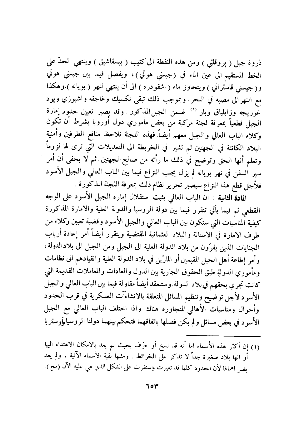 ذرْوَة جبل بروقلتي وَمن هَذِه النقطة إِلَى كثيب بيسقاشيق وَيَنْتَهِي الْحَد على الْخط الْمُسْتَقيم إِلَى عين المَاء فِي جيسني هوتي ويفصل فِيمَا بَين جيسني هوتي وجيسني قاستراني ويتجاوز مَاء اشقودره إِلَى ان يَنْتَهِي لنهر بويانه وَهَكَذَا مَعَ النَّهر إِلَى مصبه فِي الْبَحْر وبموجب ذَلِك تبقى نكسيك وغاجقه واشبوزي وَيَوَد غوريجه وزابلياق وبار ضمن الْجَبَل الْمَذْكُور وَقد يصير تعْيين حُدُود امارة الْجَبَل قَطْعِيا بِمَعْرِِفَة لجنة مركبة من بعض ماموري دوَل اوروبا بِشَرْط ان تكون وكلاء الْبَاب العالي والجبل مَعَهم ايضا فَهَذِهِ اللجنة تلاحظ مَنَافِع الطَّرفَيْنِ وامنية الْبِلَاد الكائنة فِي الْجِهَتَيْنِ ثمَّ تُشِير فِي الخريطة إِلَى التعديلات الَّتِي ترى لَهَا لُزُوما وَتعلم انها الْحق وتوضح فِي ذل مَا رَأَتْهُ من صَالح الْجِهَتَيْنِ ثمَّ لَا يخفى ان امْر سير السفن فِي نهر بويانه لم يزل يجلب النزاع فِيمَا بَين الْبَاب العالي والجبل الاسود فلاجل قطع هَذَا النزاع سيصير تَحْرِير نظام ذَلِك بِمَعْرِِفَة اللجنة الْمَذْكُورَة