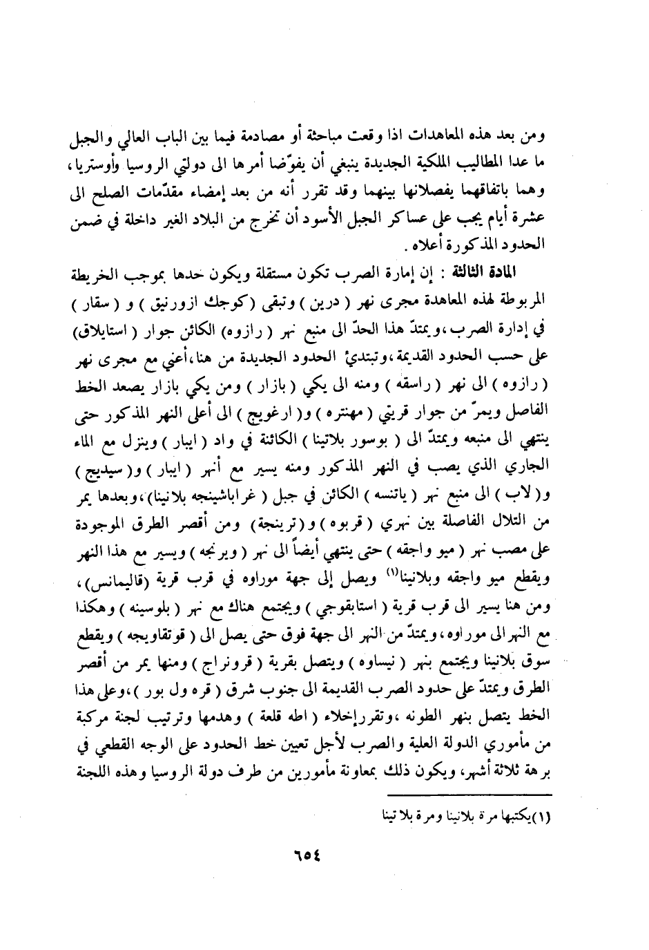 الْمَادَّة الثَّالِثَة ان امارة الصرب تكون مُسْتَقلَّة وَيكون حَدهَا بِمُوجب الخريطة المربوطة لهَذِهِ المعاهدة مجْرى نهر درين وَتبقى كوجك ازورنيق وسقار فِي ادارة الصرب ويمتد هَذَا الْحَد إِلَى منبع نهر رازوه الْكَائِن جوَار استايلاق على حسب الْحُدُود الْقَدِيمَة وتبتدئ الْحُدُود الجديدة من هُنَا اعني مَعَ مجْرى نهر رازوه إِلَى نهر راسقه وَمِنْه إِلَى يكي بازار وَمن يكي بازار يصعد الْخط الْفَاصِل ويمر من جوَار قريتي مهنتره وارغويج إِلَى اعلى النَّهر المذكورحتى يَنْتَهِي إِلَى منبعه ويمتد إِلَى بوسور بلاتينا الكائنة فِي وَاد ايبار وَينزل مَعَ المَاء الْجَارِي الَّذِي يصب فِي النَّهر الْمَذْكُور وَمِنْه يسير مَعَ انهر ايبار وسيديج ولاب إِلَى منبع نهر ياتنسه الْكَائِن فِي جبل غراباشينجه بلانينا وَبعدهَا يمر من التلال الفاصلة بَين نهري قربوه وترينجة وَمن اقصر الطّرق الْمَوْجُودَة على مصب نهر ميو واجقه حَتَّى يَنْتَهِي ايضا إِلَى نهر ويرنجه ويسير مَعَ هَذَا النَّهر وَيقطع ميو واجقه وبلانينا ويصل إِلَى جِهَة موراوه فِي قرب قَرْيَة قاليمانس وَمن هُنَا يسير إِلَى قرب قَرْيَة استابقوجي ويجتمع هُنَاكَ مَعَ نهر بلوسينه وَهَكَذَا مَعَ النَّهر إِلَى موراوه ويمتد من النَّهر إِلَى جِهَة فَوق حَتَّى يصل إِلَى قوتقاويجه وَيقطع سوق بلانينا ويجتمع بنهر نيساوه ويتصل بقرية قرونراج وَمِنْهَا يمر من اقصر الطّرق ويمتد على حُدُود الصرب الْقَدِيمَة إِلَى جنوب شَرق قره ول بور وعَلى هَذَا الْخط يتَّصل بنهر الطونه وتقرر اخلاء اطه قلعة وهدمها وترتيب لجنة مركبة من ماموري الدولة الْعلية والصرب لاجل تعْيين خطّ الْحُدُود على الْوَجْه الْقطعِي فِي بُرْهَة ثَلَاثَة اشهر وَيكون ذَلِك بمعاونة مامورين من طرف دولة الروسيا وَهَذِه اللجنة