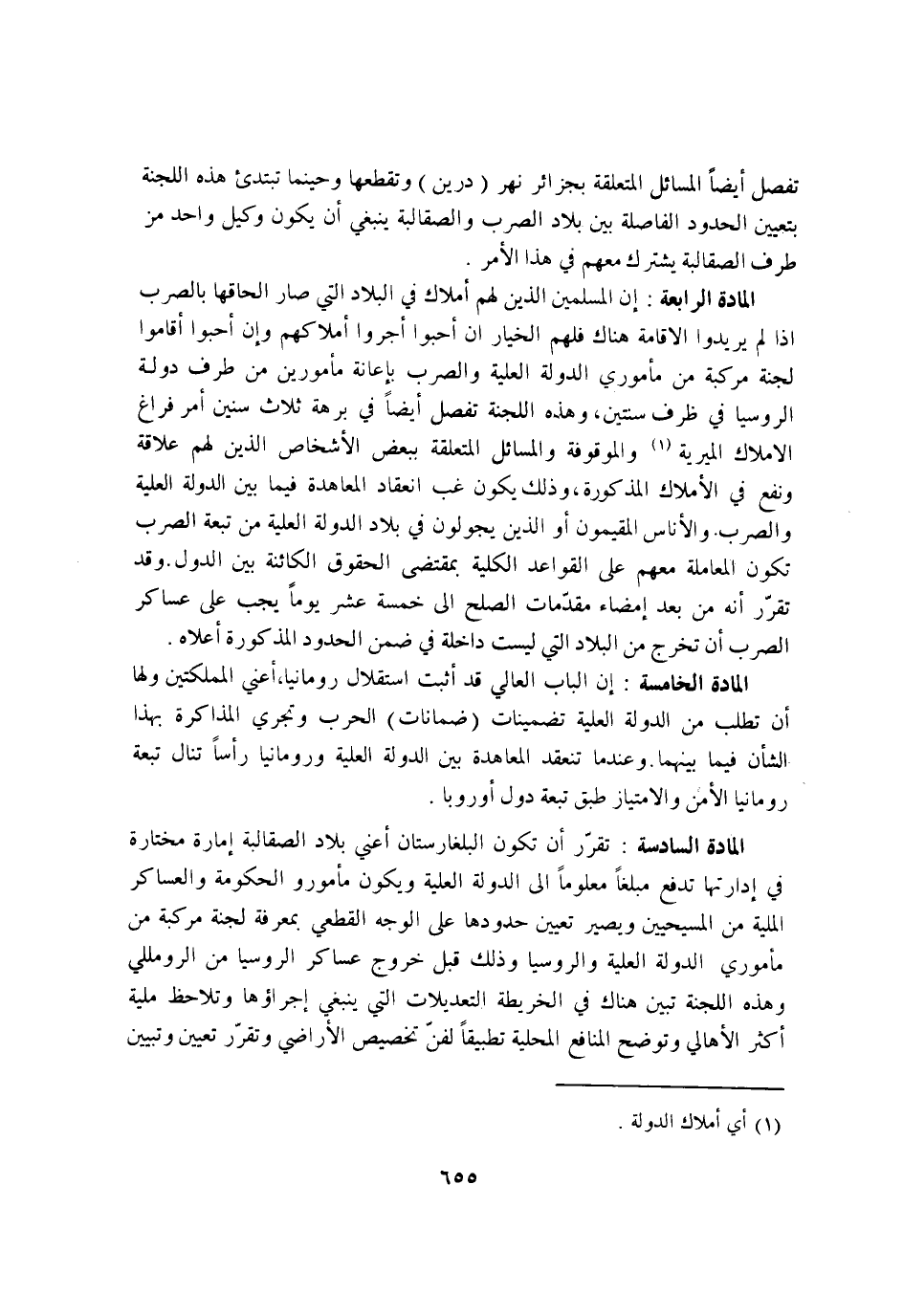 الْمَادَّة السَّادِسَة تقرر ان تكون البلغارستان اعني بِلَاد الصقالبة امارة مختارة فِي ادارتها تدفع مبلغا مَعْلُوما إِلَى الدولة الْعلية وَيكون مامورو الْحُكُومَة والعساكر الملية من المسيحيين وَيصير تعْيين حُدُودهَا على الْوَجْه الْقطعِي بِمَعْرِِفَة لجنة مركبة من ماموري الدولة الْعلية والروسيا وَذَلِكَ قبل خُرُوج عَسَاكِر الروسيا من الرومللي وَهَذِه اللجنة تبين هُنَاكَ فِي الخريطة التعديلات الَّتِي يَنْبَغِي اجراؤها وتلاحظ ملية اكثر الاهالي وتوضح الْمَنَافِع الْمَحَلِّيَّة تطبيقا لفن تَخْصِيص الاراضي وتقرر تعْيين وتبيين