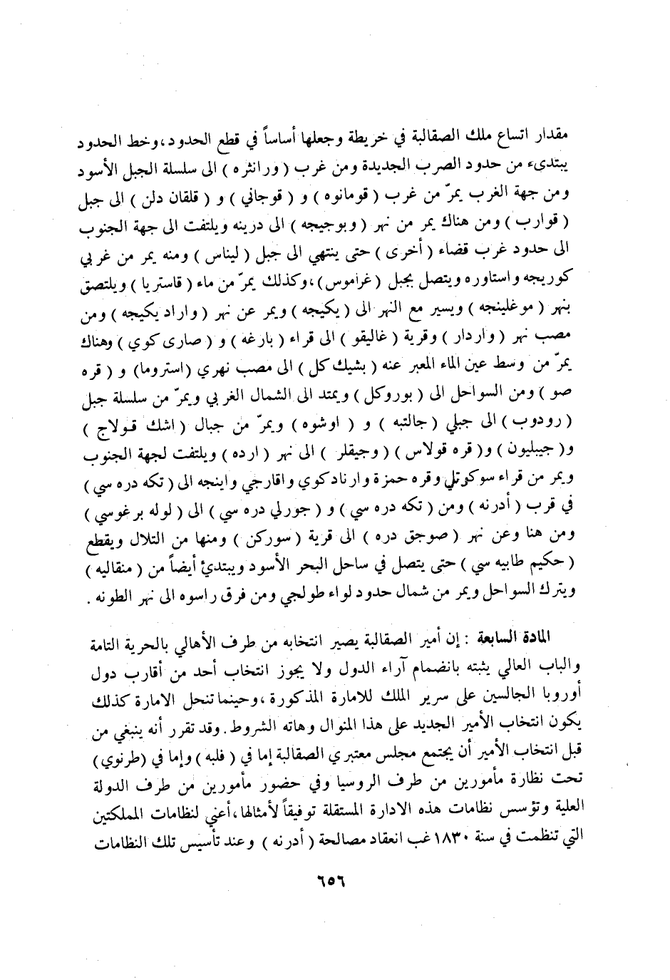 الْمَادَّة السَّابِعَة ان امير الصقالبة يصير انتخابه من طرف الاهالي بِالْحُرِّيَّةِ التَّامَّة وَالْبَاب العالي يُثبتهُ بانضمام آراء الدول وَلَا يجوز انتخاب اُحْدُ من اقارب دوَل اوروبا الجالسين على سَرِير الْملك للامارة الْمَذْكُورَة وحينما تنْحَل الامارة كَذَلِك يكون انتخاب الامير الْجَدِيد على هَذَا المنوال وهاته الشُّرُوط وَقد تقرر انه يَنْبَغِي من قبل انتخاب الامير ان يجْتَمع مجْلِس معتبري الصقالبة اما فِي فلبه واما فِي طرنوي تَحت نظارة مامورين من طرف الروسيا وَفِي حُضُور مامورين من طرف الدولة الْعلية وتؤسس نظامات هَذِه الادارة المستقلة تَوْفِيقًا لامثالها اعني لنظامات المملكتين الَّتِي تنظمت فِي سنة 1830 غب انْعِقَاد مصالحة ادرنه وَعند تأسيس تِلْكَ النظامات