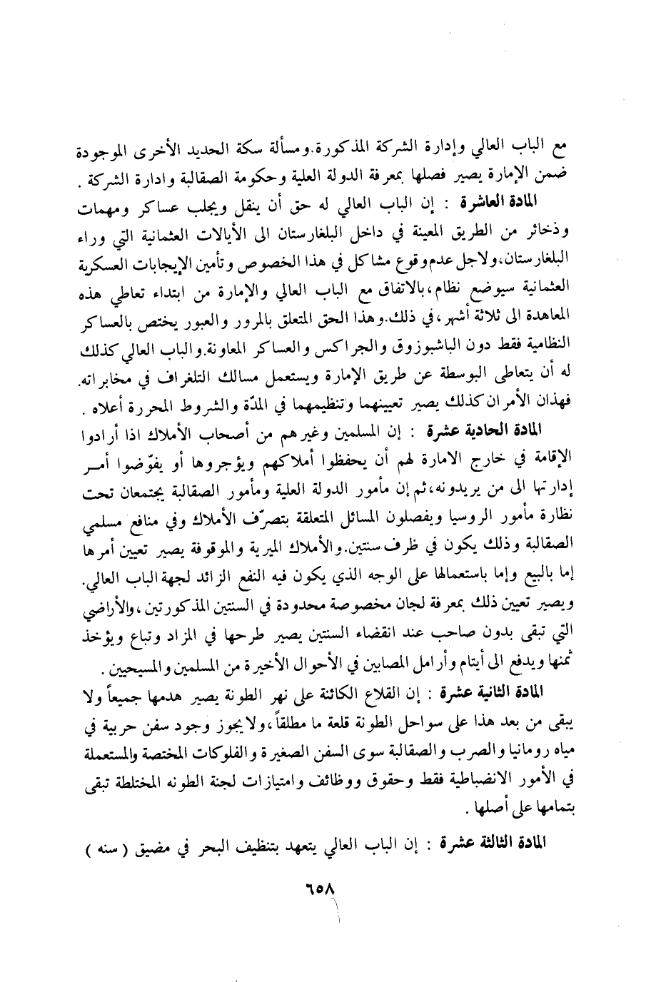 مَعَ الْبَاب العالي وادارة الشّركَة الْمَذْكُورَة وَمَسْأَلَة سكَّة الْحَدِيد الاخرى الْمَوْجُودَة ضمن الامارة يصير فصلها بِمَعْرِِفَة الدولة الْعلية وحكومة الصقالبة وادارة الشّركَة