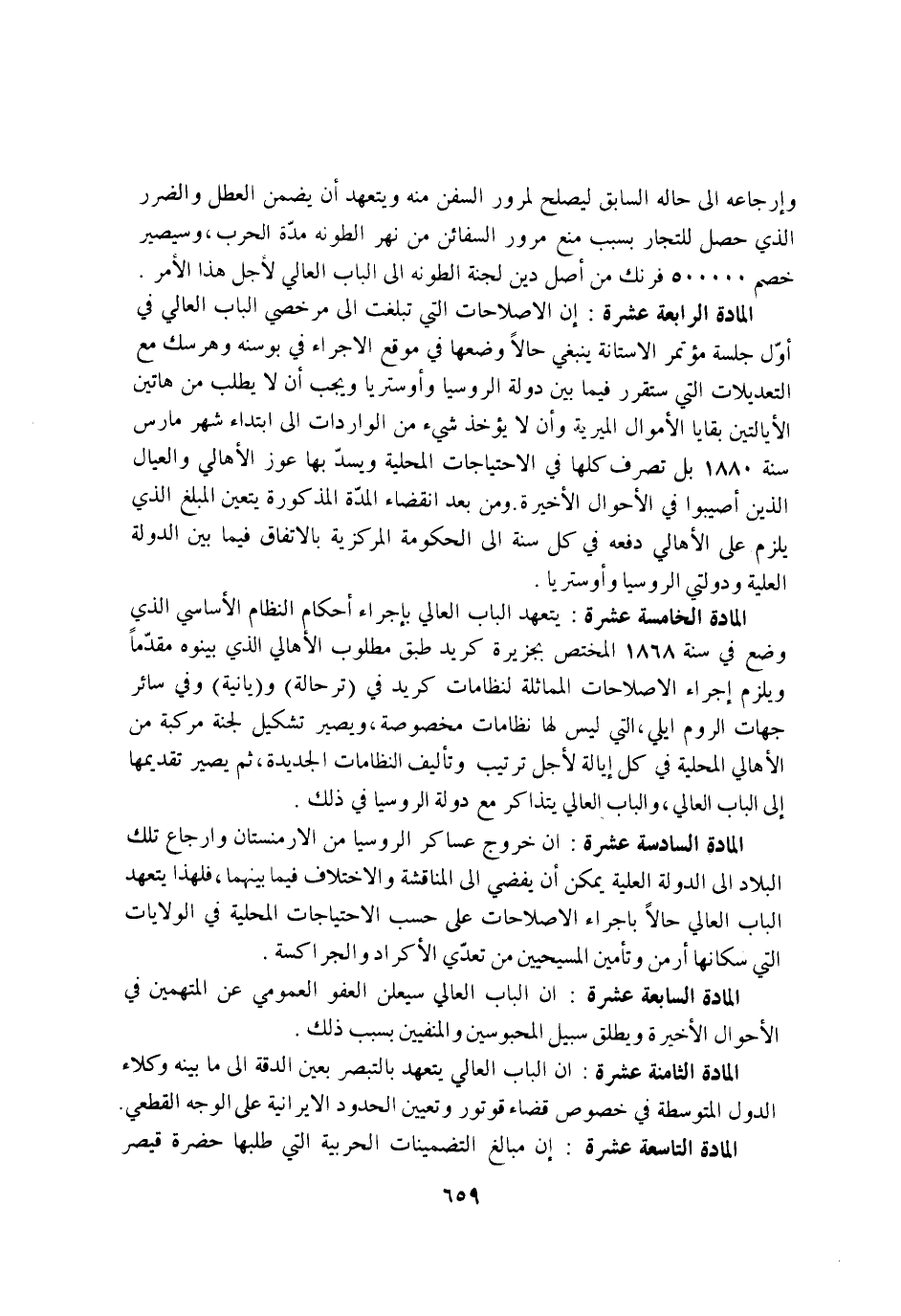 الْمَادَّة الْخَامِسَة عشرَة يتعهد الْبَاب العالي باجراء احكام النظام الاساسي الَّذِي وضع فِي اسنة 1868 الْمُخْتَص بِجَزِيرَة كريد طبق مَطْلُوب الاهالي الَّذِي بَينُوهُ مقدما وَيلْزم اجراء الاصلاحات الْمُمَاثلَة لننظامات كريد فِي ترحالة ويانية وَفِي سَائِر جِهَات الرّوم ايلي الَّتِي لَيْسَ لَهَا نظامات مَخْصُوصَة وَيصير تشكيل لجنة مركبة من الاهالي الْمَحَلِّيَّة فِي كل ايالة لاجل تَرْتِيب وتأليف النظامات الجديدة ثمَّ يصير تَقْدِيمهَا إِلَى الْبَاب العالي وَالْبَاب العالي يتذاكر مَعَ دولة الروسيا فِي ذَلِك