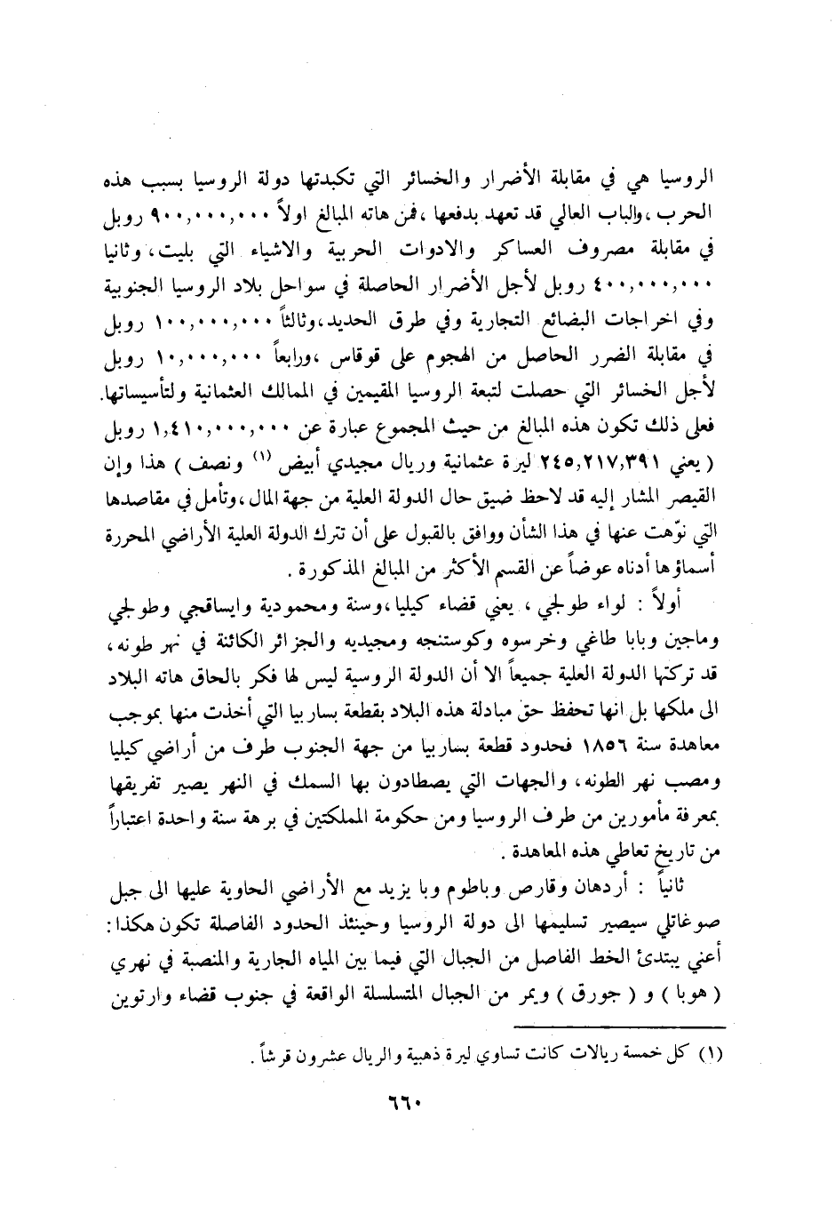 الروسيا هِيَ فِي مُقَابلَة الاضرار والخسائر الَّتِي تكبدتها دولة الروسيا بِسَبَب هَذِه الْحَرْب وَالْبَاب العالي قد تعهد بدفعها فَمن هاته المبالغ اولا 00 000 000 9 روبل فِي مُقَابلَة مَصْرُوف العساكر والادوات الحربية والاشياء الَّتِي بليت وَثَانِيا 00 000 000 4 روبل لاجل الاضرار الْحَاصِلَة فِي سواحل بِلَاد الروسيا الجنوبية وَفِي اخراجات البضائع التجارية وَفِي طرق الْحَدِيد وثالثا 00 000 000 1 روبل فِي مُقَابلَة الضَّرَر الْحَاصِل من الهجوم على قوقاس ورابعا 0 000 000 0 اروبل لاجل الخسائر الَّتِي حصلت لتبعة الروسيا المقيمين فِي الممالك العثمانية ولتأسيساتها فعلى ذَلِك تكون هَذِه المبالغ من حَيْثُ الْمَجْمُوع عبارَة عَن 000 000 1410 روبل يَعْنِي 245 217 391 ليرة عثمانية وريال مجيدي ابيض وَنصف هَذَا وان القيصر الْمشَار اليه قد لاحظ ضيق حَال الدولة الْعلية من جِهَة المَال وَتَأمل فِي مقاصدها الَّتِي نوهت عَنْهَا فِي هَذَا الشَّأْن وَوَافَقَ بِالْقبُولِ على ان تتْرك الدولة الْعلية الاراضي المحررة اسماؤها ادناه عوضا عَن الْقسم الاكثر من المبالغ الْمَذْكُورَة