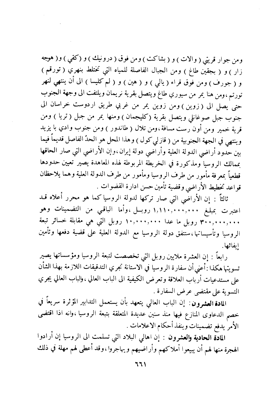 وَمن جوَار قريتي والات وبشاكت وَمن فَوق درونيك وكقي وهوجه زار وبجقين طاغ وَمن الْجبَال الفاصلة للمياه الَّتِي تختلط بنهري تورقم وجورف وَمن فَوق قراء يالي وهين وَلم كليسا إِلَى ان يَنْتَهِي لنهر تورتم وَمن هُنَا يمر من سيوري طاغ ويتصل بقرية نريمان ويلتفت إِلَى وجهة الْجنُوب حَتَّى يصل إِلَى زوين وَمن زوين يمر من غربي طَرِيق اردوست خُرَاسَان إِلَى جنوب جبل صوغانلي ويتصل بقرية كليجمان وَمِنْهَا يمر من جبل تريا وَمن قَرْيَة خمير وَمن اون رست مَسَافَة وَمن تلال طاندور وَمن جنوب وَادي بايزيد وَيَنْتَهِي فِي الْجِهَة الجنوبية من قازلي كول وَهَذَا الْمحل هُوَ الْحَد الْفَاصِل قَدِيما فِيمَا بَين حُدُود اراضي الدولة الْعلية واراضي دولة ايران وان الاراضي الَّتِي صَار الحاقها بممالك الروسيا ومذكورة فِي الخريطة المربوطة لهَذِهِ المعاهدة يصير تعْيين حُدُودهَا قَطْعِيا بِمَعْرِِفَة مامور من طرف الروسيا ومامور من طرف الدولة الْعلية وهما يلاحظان قَوَاعِد تخطيط الاراضي وَقَضِيَّة تامين حِين ادارة القضوات
