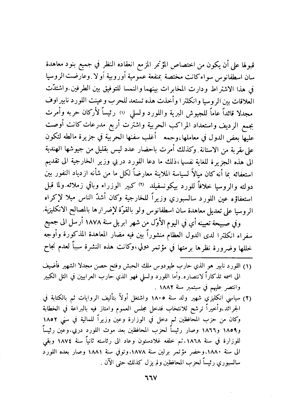 قبُولهَا على ان يكون من اخْتِصَاص المؤتمر المزمع انْعِقَاده النّظر فِي جَمِيع بنود معاهدة سان اسطفانوس سَوَاء كَانَت مُخْتَصَّة بِمَنْفَعَة عمومية اوروبية اولا وعارضت الروسيا فِي هَذَا الِاشْتِرَاط ودارت المخابرات بَينهمَا والنمسا للتوفيق بَين الطَّرفَيْنِ واشتدت العلاقات بَين الروسيا وانكلترا واخذت هَذِه تستعد للحرب وعينت اللورد نابيراوف مجدلا قائدا عَاما للجيوش الْبَريَّة واللورد ولسلي رَئِيسا لاركان حربه وامرت بِجمع الرديف واستعداد المراكب الحربية واشترت ارْبَعْ مدرعات كَانَت اوصت عَلَيْهَا بعض الدول فِي معاملها وَجمع اغلب سفنها الحربية فِي جَزِيرَة مالطه لتَكون على مقربة من الاستانة وَكَذَلِكَ امرت باحضار عدد لَيْسَ بِقَلِيل من جيوشها الْهِنْدِيَّة إِلَى هَذِه الجزيرة للغاية نَفسهَا ذَلِك مَا دَعَا اللورد دربي وَزِير الخارجية إِلَى تَقْدِيم استعفائه بِمَا انه كَانَ ميالا لسياسة الملاينة مُعَارضا لكل مَا من شَأْنه ازدياد النفور بَين دولته والروسيا خلافًا للورد بيكونسفيلد كَبِير الوزراء وَبَاقِي زملائه وَلما قبل استعفاؤه عين اللورد سالسبوري وزيرا للخارجية وَكَانَ اشد النَّاس ميلًا لاكراه الروسيا على تَعْدِيل معاهدة سان اسطفانوس وَلَو بِالْقُوَّةِ لاضرارها بالمصالح الانكليزية