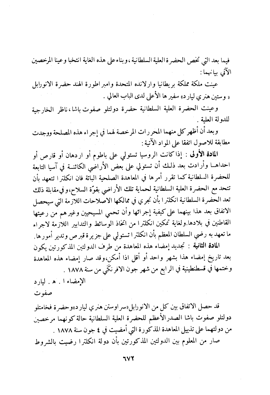 قد حصل الِاتِّفَاق بَين كل من الانورابل سراوستن هنري ليارد وحضرة فخامتلو دولتلو صفوت باشا الصَّدْر الاعظم للحضرة الْعلية السُّلْطَانِيَّة حَالَة كَونهمَا مرخصين من دولتهما على تذييل المعاهدة الْمَذْكُورَة الَّتِي امضيت فِي 4 جون سنة 1878