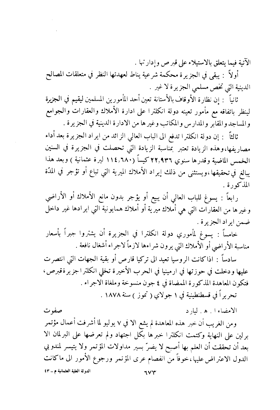 سادسا إِذا كَانَت الروسيا تعيد إِلَى تركيا قارص اَوْ بَقِيَّة الْجِهَات الَّتِي انتصرت علهيا وَدخلت فِي حوزتها فِي ارمينيا فِي الْحَرْب الاخيرة تخلي انكلترا جَزِيرَة قبرص فَتكون المعاهدة الْمَذْكُورَة الممضاة فِي 4 جون مَنْسُوخَة وملغاة الاجراء تحريرا فِي قسطنطينية فِي 1 جولاي تموز سنة 1878 الامضاء اليارد صفوت