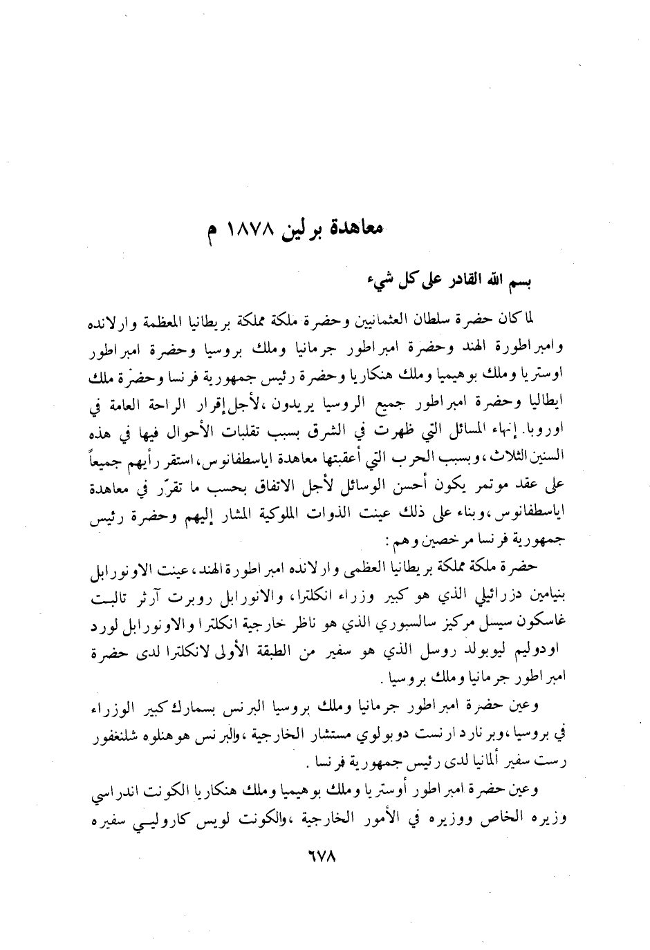 لما كَانَ حَضْرَة سُلْطَان العثمانيين وحضرة ملكة مملكة بريطانيا المعظمة وارلانده وامبراطورة الْهِنْد وحضرة امبراطور جرمانيا وَملك بروسيا وحضرة امبراطور اوستريا وَملك بوهيميا وَملك هنكاريا وحضرة رَئِيس جمهورية فرنسا وحضرة ملك ايطاليا وحضرة امبراطور جَمِيع الروسيا يُرِيدُونَ لاجل اقرار الرَّاحَة الْعَامَّة فِي اوروبا انهاء الْمسَائِل الَّتِي ظَهرت فِي الشرق بِسَبَب تقلبات الاحوال فِيهَا فِي هَذِه السنين الثَّلَاث وبسبب الْحَرْب الَّتِي اعقبتها معاهدة اياسطفانوس اسْتَقر رَأْيهمْ جَمِيعًا على عقد مؤتمر يكون احسن الْوَسَائِل لاجل الِاتِّفَاق بِحَسب مَا تقرر فِي معاهدة اياسطفانوس وَبِنَاء على ذَلِك عينت الذوات الملوكية الْمشَار اليهم وحضرة رَئِيس جمهورية فرنسا مرخصين وهم