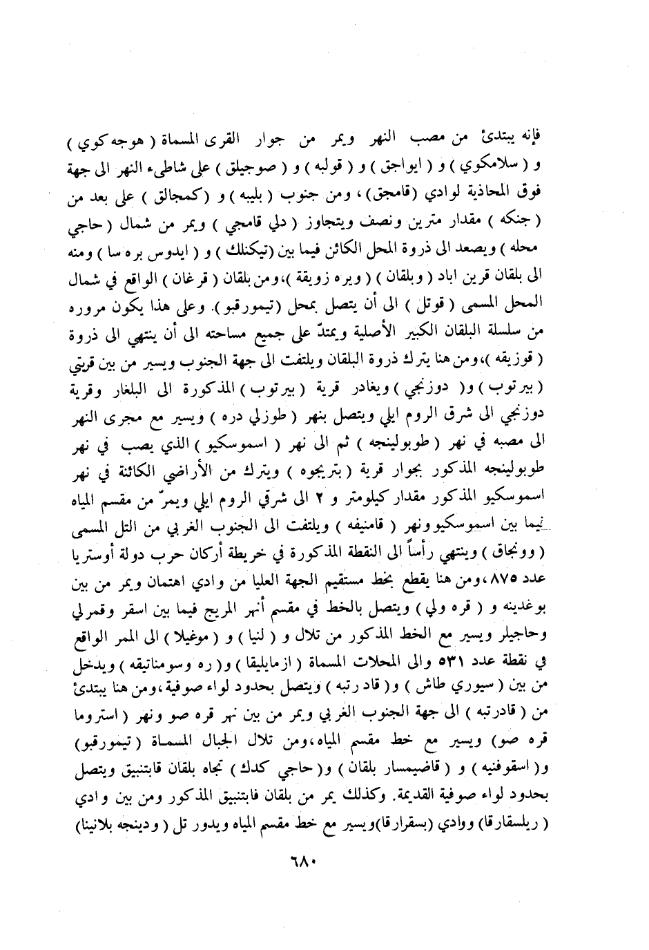 فانه يَبْتَدِئ من مصب النَّهر ويمر من جوَار الْقرى الْمُسَمَّاة هوجه كوي وسلامكوي وايواجق وقولبه وصوجيلق على شاطئ النَّهر إِلَى جِهَة فَوق المحاذية لوادي قامجق وَمن جنوب بليبه وكمجالق على بعد من جنكه مِقْدَار مترين وَنصف ويتجاوز دُلي قامجي ويمر من شمال حاجي مَحَله ويصعد إِلَى ذرْوَة الْمحل الْكَائِن فِيمَا بَين تيككنلك وايدوس بره سا وَمِنْه إِلَى بلقان قرين اباد وبلقان ويره زويقة وَمن بلقان قرغان الْوَاقِع فِي شمال الْمحل الْمُسَمّى قوتل إِلَى ان يتَّصل بِمحل تيمورقبو وعَلى هَذَا يكون مروره من سلسلة البلقان الْكَبِير الاصلية ويمتد على جيمع مساحته إِلَى ان يَنْتَهِي إِلَى ذرْوَة قوزيقه وَمن هُنَا يتْرك ذرْوَة البلقان ويلتفت إِلَى جِهَة الْجنُوب ويسير من بَين قريتي بيرتوب ودوزنجي ويغادر لاقرية لابير توب الْمَذْكُورَة الى البغار وقرية دوزنجي الى لاشرق الرّوم ايلي وينصل بنهر طوزلي دره ويسير مَعَ مجْرى النَّهر إِلَى مصبه فِي نهر طوبولينجه ثمَّ إِلَى نهر اسموسكيو الَّذِي يصب فِي نهر طوبولينجه الْمَذْكُور بجوار قَرْيَة بتريجوه وَيتْرك من الاراضي الكائنة فِي نهر اسموسكيو الْمَذْكُور مِقْدَار كيلومتر و 2 إِلَى شَرْقي الرّوم ايلي ويمر من مقسم الْمِيَاه فِيمَا بَين اسموسكيو ونهر قامنيفه ويلتفت إِلَى الْجنُوب الغربي من التل الْمُسَمّى وونجاق وَيَنْتَهِي رَأْسا إِلَى النقطة الْمَذْكُورَة فِي خريطة اركان حَرْب دولة اوستريا عدد 875 وَمن هُنَا يقطع بِخَط مُسْتَقِيم الْجِهَة الْعليا من وَادي اهتمان ويمر من بَين بوغدينه وقره ولي ويتصل بالخط فِي مقسم انهر المريج فِيمَا بَين اسقر وقمرلي وحاجيلر ويسير مَعَ الْخط الْمَذْكُور من تلال ولنيا وموغيلا إِلَى الْمَمَر الْوَاقِع فِي نقطة عدد 531 وَإِلَى المحلات الْمُسَمَّاة ازمايليقا وره وسومناتيقه وَيدخل من بَين سيوري طاش وقاد رتبه ويتصل بحدود لِوَاء صوفية وَمن هُنَا يَبْتَدِئ من قادرتبه إِلَى جِهَة الْجنُوب الغربي ويمر من بَين نهر قره صو ونهر استروما قره صو ويسير مَعَ خطّ مقسم الْمِيَاه وَمن تلال الْجبَال الْمُسَمَّاة تيمورقبو واسقوفنيه وقاضيمسار بلقان وحاجي كدك تجاه بلقان قابتنبيق ويتصل بحدود لِوَاء صوفية الْقَدِيمَة وَكَذَلِكَ يمر من بلقان فابتنبيق الْمَذْكُور وَمن بَين وَادي ريلسقارقا ووادي بسقرارقا ويسير مَعَ خطّ مقسم الْمِيَاه ويدور تل ودينجه بلانينا