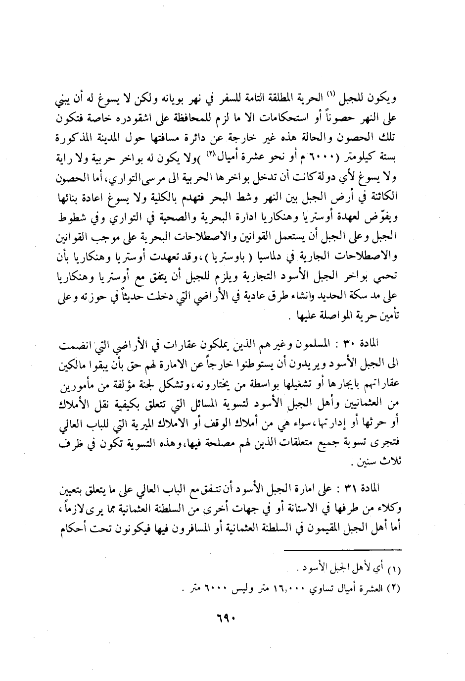 الْمَادَّة 30 الْمُسلمُونَ وَغَيرهم الَّذين يملكُونَ عقارات فِي الاراضي الَّتِي انضمت إِلَى الْجَبَل الاسود ويريدون ان يستوطنوا خَارِجا عَن الامارة لَهُم حق بِأَن يبقوا مالكين عقاراتهم بايجارها اَوْ تشغيلها بِوَاسِطَة من يختارونه وتشكل لجنة مؤلفة من مأمورين من العثمانيين واهل الْجَبَل الاسود لتسوية الْمسَائِل الَّتِي تتَعَلَّق بكيفية نقل الاملاك اَوْ حرثها اَوْ ادارتها سَوَاء هِيَ من املاك الْوَقْف اَوْ الاملاك الميرية الَّتِي للباب العالي فتحرى تَسْوِيَة جَمِيع متعلقات الَّذين لَهُم مصلحَة فِيهَا وَهَذِه التَّسْوِيَة تكون فِي ظرف ثَلَاث سِنِين