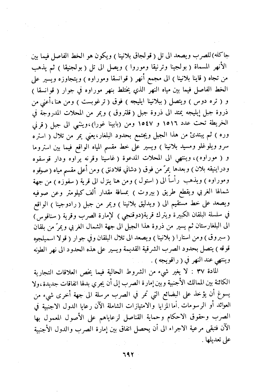 جاكله للصرب ويصعد إِلَى تل قولجاق بلانينا وَيكون هُوَ الْخط الْفَاصِل فِيمَا بَين الانهر الْمُسَمَّاة بولجينا وترنيقا وموروا ويصل إِلَى تل بولجنيقا ثمَّ يذهب من تجاه قاينا بلانينا إِلَى مجمع انهر قوانسقا وموراوه ويتجاوزه ويسير على الْخط الْفَاصِل فِيمَا بَين مياه النَّهر الَّذِي يخْتَلط بنهر موراوه فِي جوَار قوانسقا وتره دوس ويتصل ببلانينا ايليجه فَوق ترغوبست وَمن هُنَا اعني من ذرْوَة جبل ايليجه يَمْتَد إِلَى ذرْوَة جبل قلتروق ويمر من المحلات المدروجة فِي الخريطة تَحت عدد 1516 و 1547 وَمن بابينا غورا وَيَنْتَهِي إِلَى جبل قَرْني وره ثمَّ يَبْتَدِئ من هَذَا الْجَبَل ويجتمع بحدود البلغار يَعْنِي يمر من تلال استره سرو ويلوغلو ومسيد بلانينا ويسير على خطّ مقسم الْمِيَاه الْوَاقِع فِيمَا بَين استروما وموراوه وَيَنْتَهِي إِلَى المحلات الدعْوَة غاسينا وقرنه يراوه وَدَار قوسقوه ودراينيقه بلان وَبعدهَا يمر من فَوق دشاني قلادنق وَمن اعلى مقسم مياه صوقوه وموراوه وَيذْهب راسا إِلَى استول وَمن هُنَا ينزل إِلَى قَرْيَة سفوزه من جِهَة شمالها الغربي وَيقطع طَرِيق بيروت بمسافة مِقْدَار الف كيلو متر وَعَن صوفيه ويصعد على خطّ مُسْتَقِيم إِلَى ويدليق بلانينا ويمر من جبل رادوجينا الْوَاقِع فِي سلسلة البلقان الْكَبِيرَة وَيتْرك قَرْيَة دوقنجي لامارة الصرب وقرية سناقوس إِلَى البلغارستان ثمَّ يسير من دروة هَذَا الْجَبَل إِلَى جِهَة الشمَال الغربي ويمر من بلقان سبروق وَمن استارا بلانينا ويصعد إِلَى تلال البلقان وَفِي جوَار قولا اسميلجوة قوقه يتَّصل بحدود الصرب الشرقية الْقَدِيمَة ويسير على هَذِه الْحُدُود إِلَى نهر الطونه وَيَنْتَهِي عِنْد النَّهر فِي راقويجه