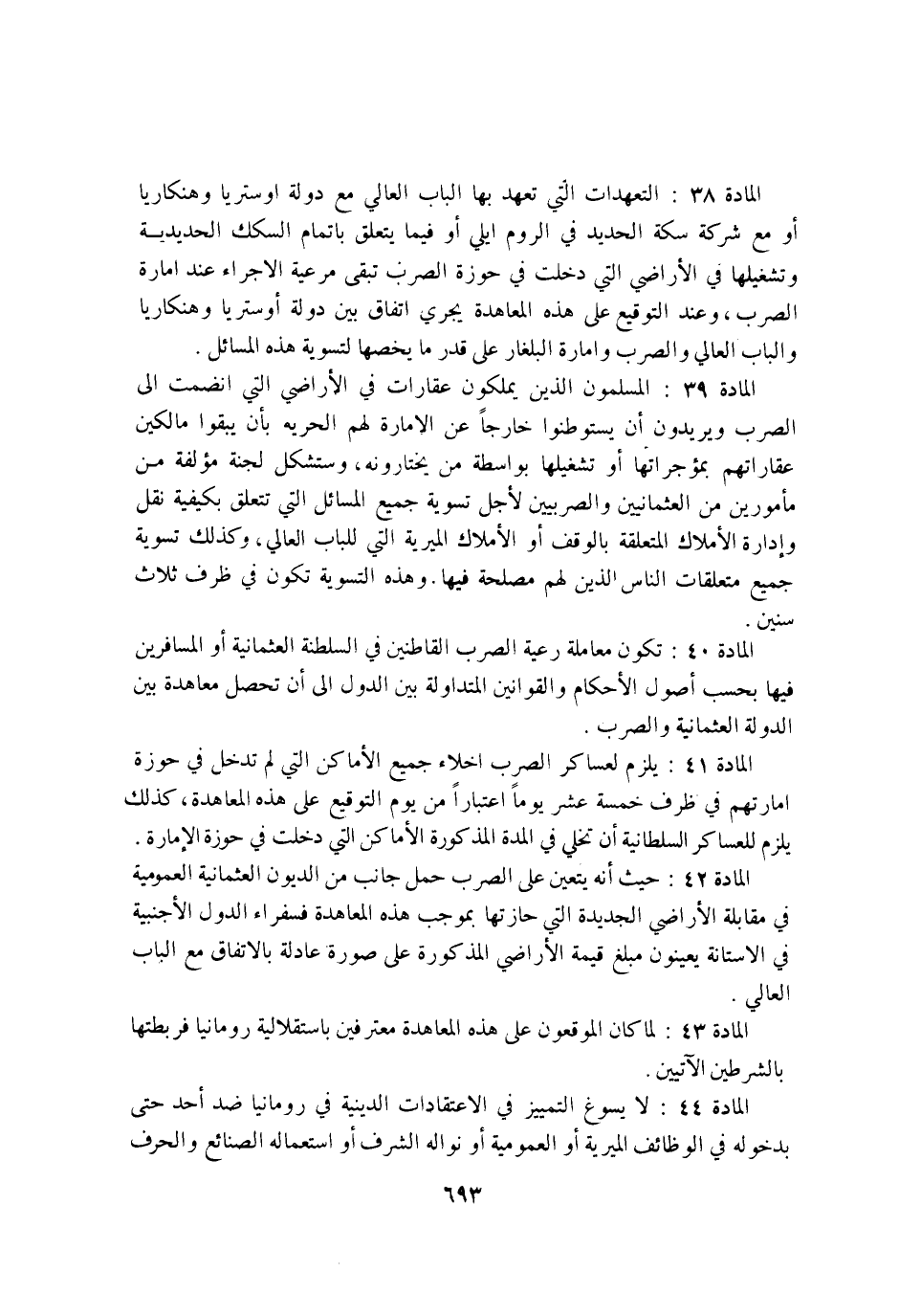الْمَادَّة 43 لما كَانَ الموقعون على هَذِه المعاهدة معترفين باستقلالية رومانيا فربطتها بالشرطين الآتيين