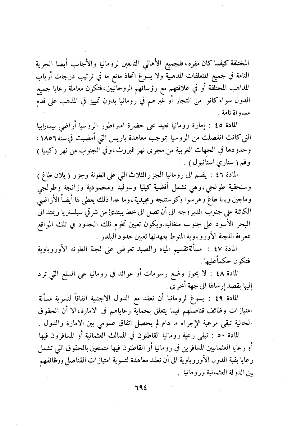 الْمَادَّة 45 امارة رومانيا تعيد على حَضْرَة امبراطور الروسيا اراضي بيسارابيا الَّتِي كَانَت انفصلت من الروسيا بِمُوجب معاهدة باريس الَّتِي امضيت فِي سنة 1856 وحدودها فِي الْجِهَات الغربية من مجْرى نهر البروث وَفِي الْجنُوب من نهر كيليا وفم ستاري استانبول