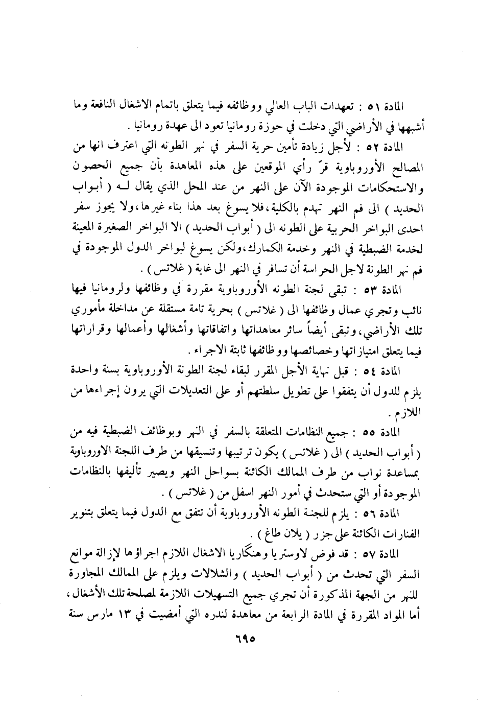 الْمَادَّة 52 لأجل زِيَادَة تَأْمِين حريَّة السّفر فِي نهر الطونة الَّتِي اعْترف انها من الْمصَالح الاوروباوية قر رَأْي الموقعين على هَذِه المعاهدة بِأَن جَمِيع الْحُصُون والاستحكامات الْمَوْجُودَة الْآن على النَّهر من عِنْد الْمحل الَّذِي يُقَال لَهُ ابواب الْحَدِيد إِلَى فَم النَّهر تهدم بِالْكُلِّيَّةِ فَلَا يسوغ بعد هَذَا بِنَاء غَيرهَا وَلَا يجوز سفر احدى البواخر الحربية على الطونه إِلَى ابواب الْحَدِيد الا البواخر الصَّغِيرَة الْمعينَة لخدمة الضبطية فِي النَّهر وخدمة الكمارك وَلَكِن يسوغ لبواخر الدول الْمَوْجُودَة فِي فَم نهر الطونة لاجل الحراسة ان تُسَافِر فِي النَّهر إِلَى غَايَة غلاتس