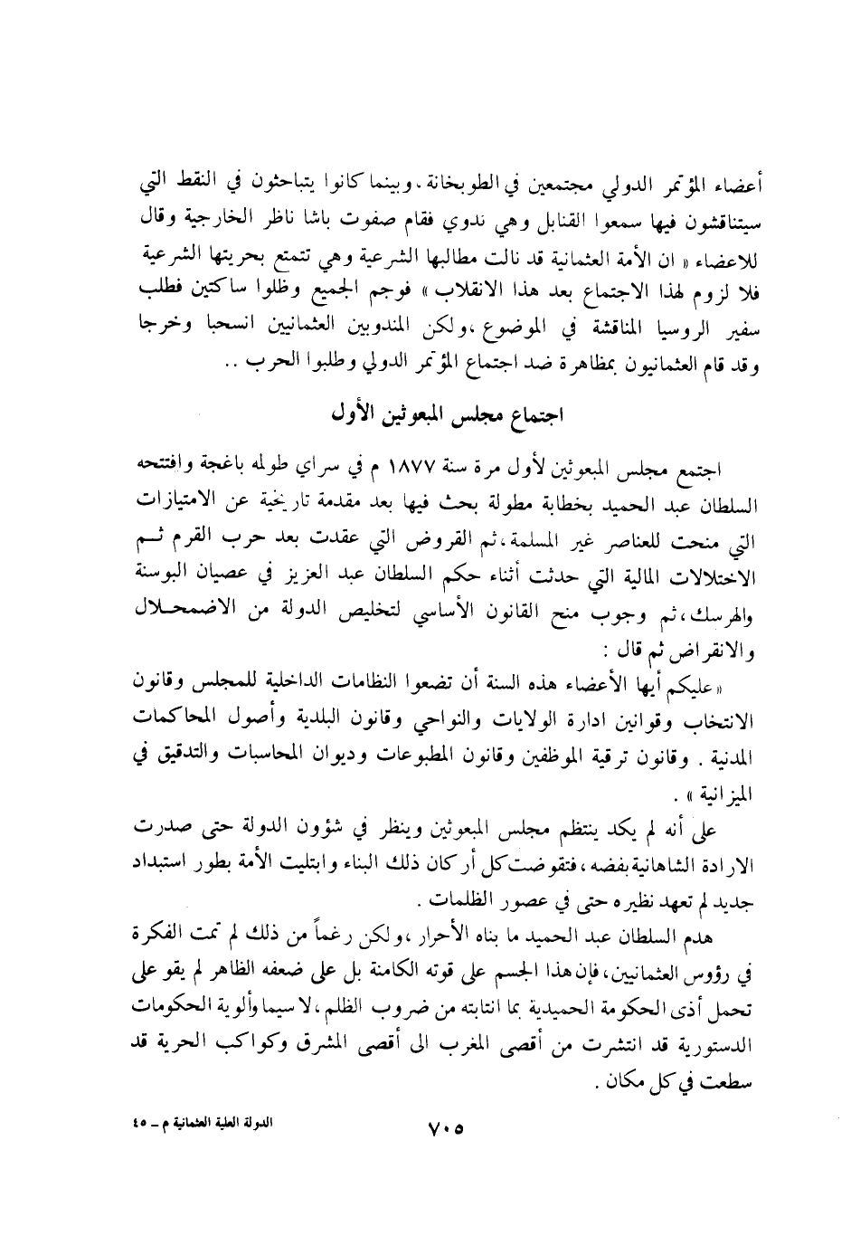 اجْتمع مجْلِس المبعوثين لاول مرّة سنة 1877 م فِي سراي طولمه باغجة وافتتحه السُّلْطَان عبد الحميد بخطابة مُطَوَّلَة بحث فِيهَا بعد مُقَدّمَة تاريخية عَن الامتيازات الَّتِي منحت للعناصر غير الْمسلمَة ثمَّ القروض الَّتِي عقدت بعد حَرْب القرم ثمَّ الاختلالات الْمَالِيَّة الَّتِي حدثت اثناء حكم السُّلْطَان عبد الْعَزِيز فِي عصيان البوسنة والهرسك ثمَّ وجوب منح القانون الاساسي لتخليص الدولة من الاضمحلال والانقراض ثمَّ قَالَ