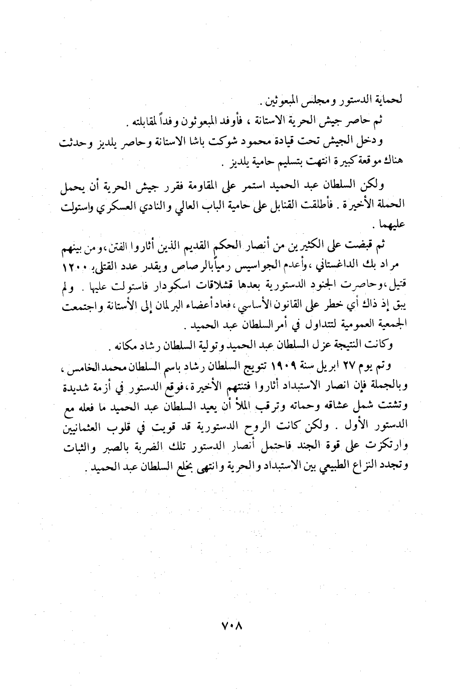 وَتمّ يَوْم 27 ابريل سنة 1909 تتويج السُّلْطَان رشاد باسم السُّلْطَان مُحَمَّد الْخَامِس وَبِالْجُمْلَةِ فان انصار الاستبداد اثاروا فتنتهم الاخيرة فَوَقع الدستور فِي ازمة شَدِيدَة وتشتت شَمل عشاقه وحماته وترقب الْمَلأ ان يُعِيد السُّلْطَان عبد الحميد مَا فعله مَعَ الدستور الاول وَلَكِن كَانَت الرّوح الدستورية قد قويت فِي قُلُوب العثمانيين وارتكزت على قُوَّة الْجند فَاحْتمل انصار الدستور تِلْكَ الضَّرْبَة بِالصبرِ والثبات وتجدد النزاع الطبيعي بَين الاستبداد وَالْحريَّة وانْتهى بخلع السُّلْطَان عبد الحميد