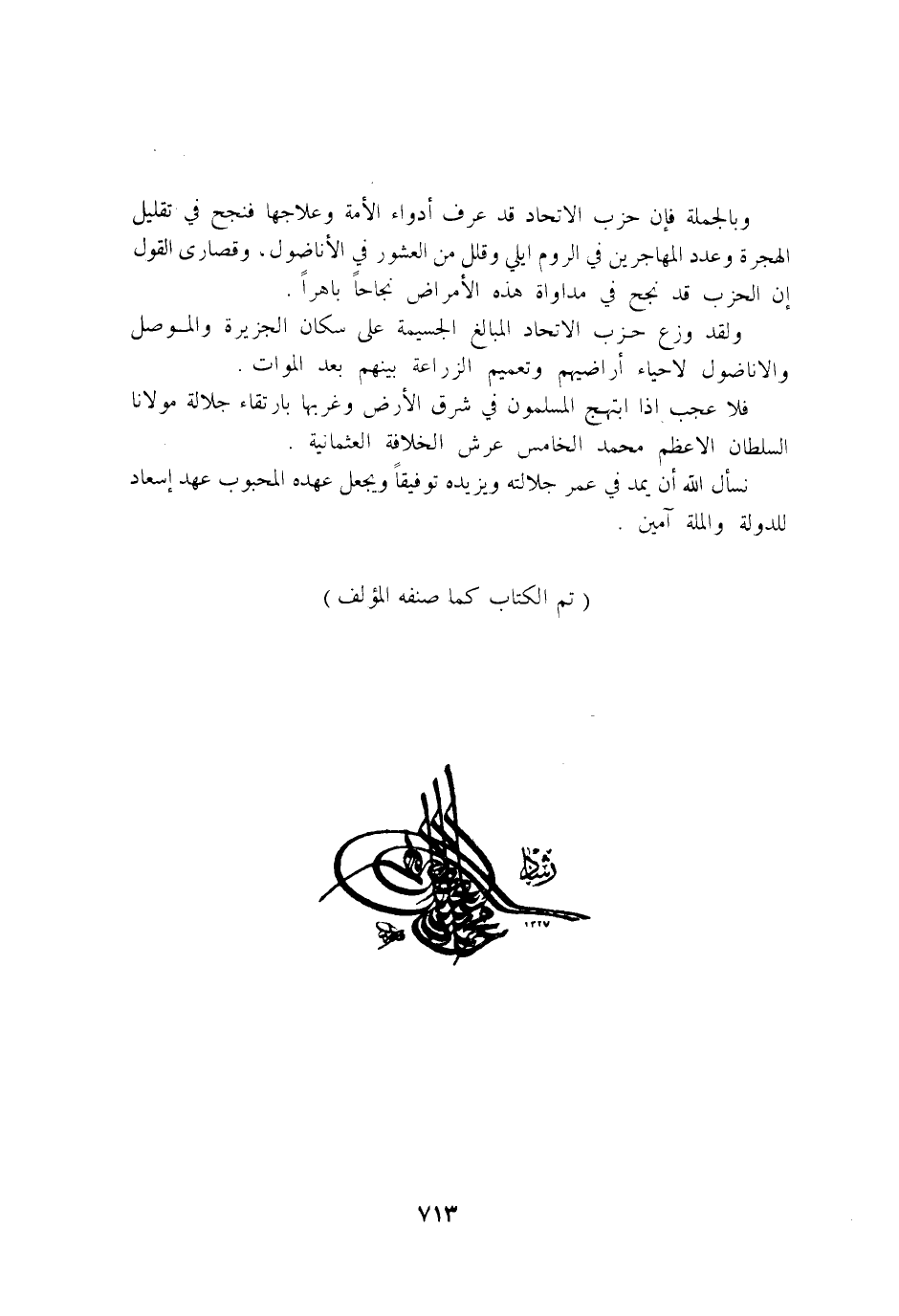وَبِالْجُمْلَةِ فان حزب الِاتِّحَاد قد عرف ادواء الامة وعلاجها فنجح فِي تقليل الْهِجْرَة وَعدد الْمُهَاجِرين فِي الرّوم ايلي وقلل من العشور فِي الاناضول وقصارى القَوْل ان الحزب قد نجح فِي مداواة هَذِه الامراض نجاحا باهرا