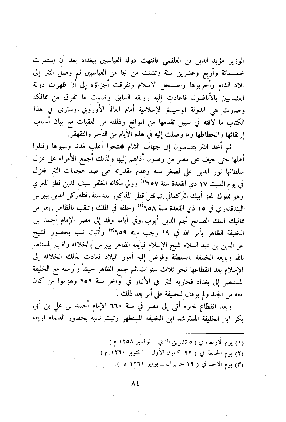 الْوَزير مؤيد الدّين بن العلقمي فانتهت دولة العباسيين بِبَغْدَاد بعد ان استمرت خَمْسمِائَة واربع وَعشْرين سنة وتشتت من نجا من العباسيين ثمَّ وصل التتر إِلَى بِلَاد الشَّام واخربوها واضمحل الاسلام وَتَفَرَّقَتْ اجزاؤه إِلَى ان ظَهرت دولة العثمانيين بالاناضول فاعادت اليه رونقه السَّابِق وضمت مَا تفرق من ممالكه وَصَارَت هِيَ الدولة الوحيدة الاسلامية امام الْعَالم الاوروبي وسترى فِي هَذَا الْكتاب مَا لاقته فِي سَبِيل تقدمها من الْمَوَانِع وذللته من العقبات مَعَ بَيَان اسباب ارتقائها وانحطاطها وَمَا وصلت اليه فِي هَذِه الايام من التَّأَخُّر والتقهقر