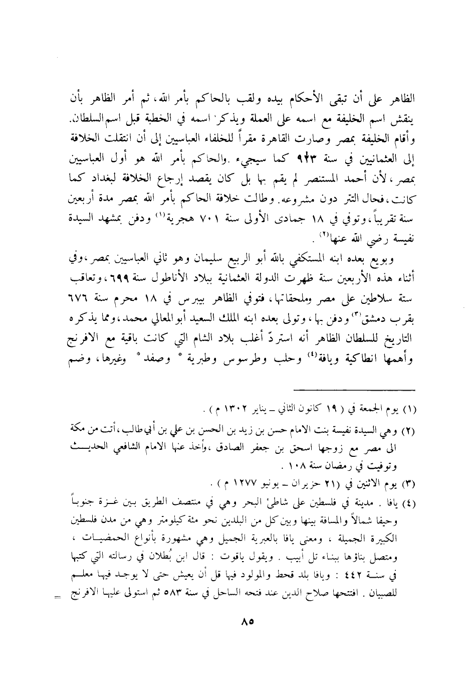 الظَّاهِر على ان تبقى الاحكام بِيَدِهِ ولقب بالحاكم بِأَمْر الله ثمَّ امْر الظَّاهِر بِأَن ينقش اسْم الْخَلِيفَة مَعَ اسْمه على العملة وَيذكر اسْمه فِي الْخطْبَة قبل اسْم السُّلْطَان واقام الْخَلِيفَة بِمصْر وَصَارَت الْقَاهِرَة مقرا للخلفاء العباسيين إِلَى ان انْتَقَلت الْخلَافَة إِلَى العثمانيين فِي سنة 923 كَمَا سَيَجِيءُ وَالْحَاكِم بامر الله هُوَ اول العباسيين بِمصْر لَان احْمَد الْمُسْتَنْصر لم يقم بهَا بل كَانَ يقْصد ارجاع الْخلَافَة لبغداد كَمَا كَانَت فحال التتر دون مشروعه وطالت خلَافَة الْحَاكِم بامر الله بِمصْر مُدَّة اربعين سنة تَقْرِيبًا وَتُوفِّي فِي 18 جُمَادَى الاولى سنة 701 هجرية وَدفن بمشهد السيدة نفيسة رَضِي الله عَنْهَا