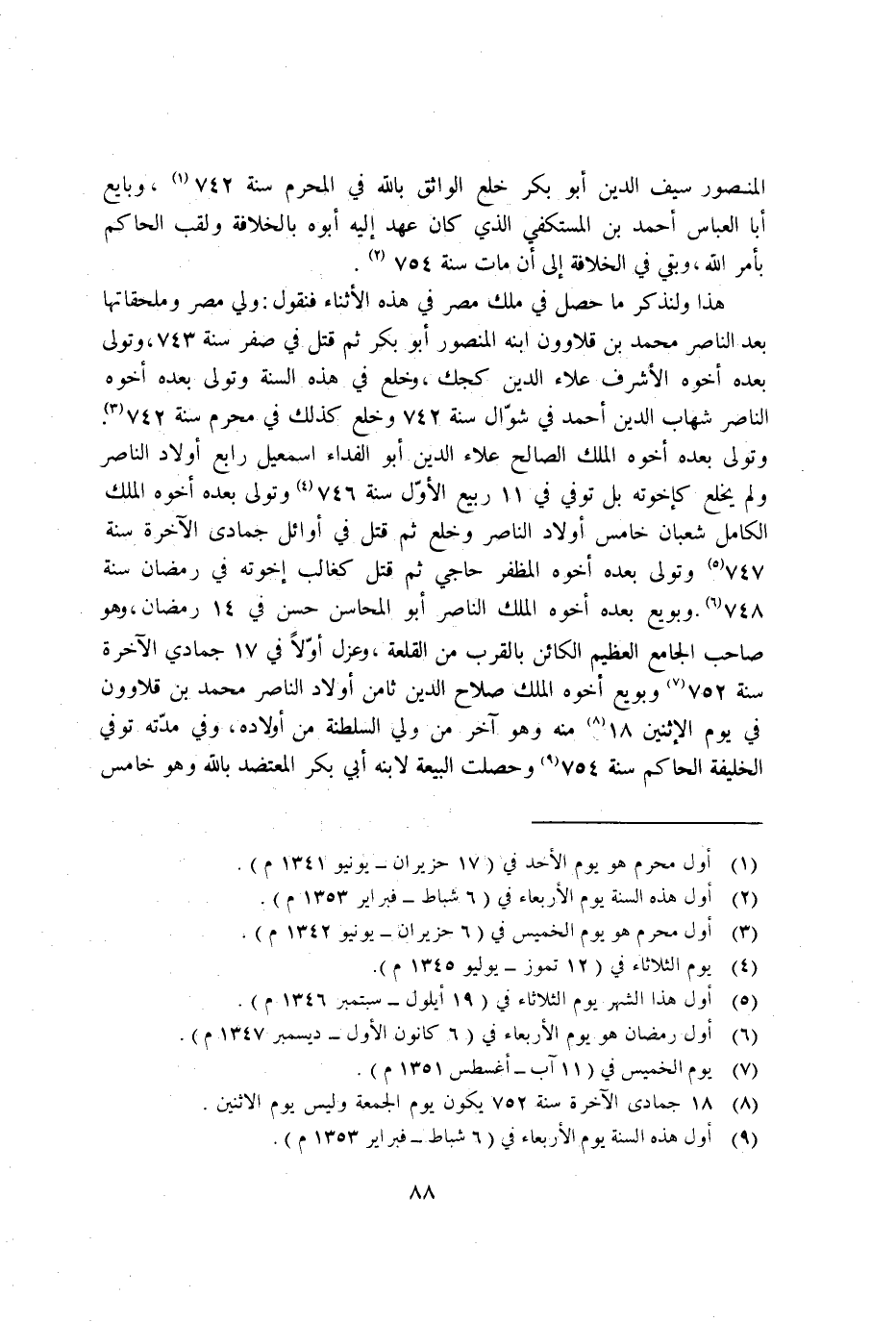 هَذَا ولنذكر مَا حصل فِي ملك مصر فِي هَذِه الاثناء فَنَقُول ولي مصر وملحقاتها بعد النَّاصِر مُحَمَّد بن قلاوون ابْنه الْمَنْصُور ابو بكر ثمَّ قتل فِي صفر سنة 743 وَتَوَلَّى بعده اخوه الاشرف عَلَاء الدّين كجك وخلع فِي هَذِه السّنة وَتَوَلَّى بعده اخوه النَّاصِر شهَاب الدّين احْمَد فِي شَوَّال سنة 742 وخلع كَذَلِك فِي محرم سنة 742 وَتَوَلَّى بعده اخوه الْملك الصَّالح عَلَاء الدّين ابو الْفِدَاء اسماعيل رَابِع اولاد النَّاصِر وَلم يخلع كإخوته بل توفّي فِي 11 ربيع الاول سنة 746 وَتَوَلَّى بعده اخوه الْملك الْكَامِل شعْبَان خَامِس اولاد النَّاصِر وخلع ثمَّ قتل فِي اوائل جُمَادَى الْآخِرَة سنة 747 وَتَوَلَّى بعده اخوه المظفر حاجي ثمَّ قتل كغالب اخوته فِي رَمَضَان سنة 748 وبويع بعده اخوه الْملك النَّاصِر ابو المحاسن حسن فِي 14 رَمَضَان وَهُوَ صَاحب الْجَامِع الْعَظِيم الْكَائِن بِالْقربِ من القلعة وعزل اولا فِي 17 جمادي الْآخِرَة سنة 752 وبويع اخوه الْملك صَلَاح الدّين ثامن اولاد النَّاصِر مُحَمَّد بن قلاوون فِي يَوْم الِاثْنَيْنِ 18 مِنْهُ وَهُوَ آخر من ولي السلطنة من اولاده وَفِي مدَّته توفّي الْخَلِيفَة الْحَاكِم سنة 754 وحصلت الْبيعَة لِابْنِهِ ابي بكر المعتضد بِاللَّه وَهُوَ خَامِس