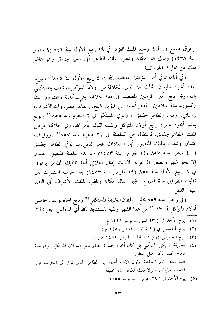 وَفِي ايامه توفّي امير الْمُؤمنِينَ المعتضد بِاللَّه فِي 4 ربيع الاول سنة 845 وبويع بعده اخوه سُلَيْمَان ثَالِث من تولى الْخلَافَة من اولاد المتَوَكل وتلقب بالمستكفي بِاللَّه وَقد بَايع امير الْمُؤمنِينَ المعتضد فِي مُدَّة خِلَافَته وَهِي ثَمَانِيَة وَعِشْرُونَ سنة وكسور سِتَّة سلاطين المظفر احْمَد بن الْمُؤَيد شيخ وَالظَّاهِر ططر وَابْنه الاشرف برسباي وَابْنه وَالظَّاهِر جقمق وَتُوفِّي المستكفي فِي 2 محرم سنة 855 وبويع بعده اخوه حَمْزَة رَابِع اولاد المتَوَكل ولقب الْقَائِم بِأَمْر الله وَفِي خِلَافَته مرض الْملك الظَّاهِر جقمق فاستقال من السلطنة فِي 21 محرم سنة 857 وَولي ابْنه عُثْمَان وتلقب بِالْملكِ الْمَنْصُور ابي السعادات فَخر الدّين ثمَّ توفّي الظَّاهِر جقمق فِي 4 صفر سنة 857 14 فبراير سنة 1453 وَلم تدم سلطنة الْمَنْصُور عُثْمَان الا نَحْو شهر وَنصف اذ عَزله الاتابك اينال العلائي اُحْدُ مماليك الظَّاهِر برقوق فِي 8 ربيع الاول سنة 857 19 مارس سنة 1453 بعد حَرْب استمرت بَين مماليك الطَّرفَيْنِ مُدَّة اسبوع وَتَوَلَّى اينال مَكَانَهُ وتلقب بِالْملكِ الاشرف ابي النَّصْر سيف الدّين