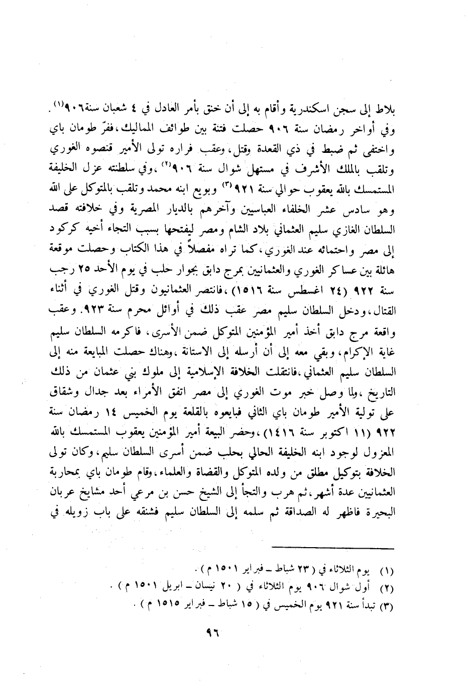بلاط إِلَى سجن اسكندرية واقام بِهِ إِلَى ان خنق بِأَمْر الْعَادِل فِي 4 شعْبَان سنة 906 وَفِي اواخر رَمَضَان سنة 906 حصلت فتْنَة بَين طوائف المماليك ففر طومان باي واختفى ثمَّ ضبط فِي ذِي الْقعدَة وَقتل وعقب فراره تولى الامير قنصوه الغوري وتلقب بِالْملكِ الاشرف فِي مستهل شَوَّال سنة 906 وَفِي سلطنته عزل الْخَلِيفَة المستمسك بِاللَّه يَعْقُوب حوالي سنة 921 وبويع ابْنه مُحَمَّد وتلقب بالمتوكل على الله وَهُوَ سادس عشر الْخُلَفَاء العباسيين وَآخرهمْ بالديار المصرية وَفِي خِلَافَته قصد السُّلْطَان الْغَازِي سليم العثماني بِلَاد الشَّام ومصر ليفتحهعا بِسَبَب التجاء اخيه كركود إِلَى مصر واحتمائه عِنْد الغوري كَمَا ترَاهُ مفصلا فِي هَذَا الْكتاب وحصلت موقعة هائلة بَين عَسَاكِر الغوري والعثمانيين بمرج دابق بجوار حلب فِي يَوْم الاحد 25 رَجَب سنة 922 24 اغسطس سنة 1516 فانتصر العثمانيون وَقتل الغوري فِي اثناء الْقِتَال وَدخل السُّلْطَان سليم مصر عقب ذَلِك فِي اوائل محرم سنة 923 وعقب وَاقعَة مرج دابق اخذ امير الْمُؤمنِينَ المتَوَكل ضمن الاسرى فاكرمه السُّلْطَان سليم غَايَة الاكرام وَبَقِي مَعَه إِلَى ان ارسله إِلَى الاستانة وَهُنَاكَ حصلت الْمُبَايعَة مِنْهُ إِلَى السُّلْطَان سليم العثماني فانتقلت الْخلَافَة الاسلامية إِلَى مُلُوك بني عُثْمَان من ذَلِك التَّارِيخ وَلما وصل خبر موت الغوري إِلَى مصر اتّفق الامراء بعد جِدَال وشقاق على تَوْلِيَة الامير طومان باي الثَّانِي فَبَايعُوهُ بالقلعة يَوْم الْخَمِيس 14 رَمَضَان سنة 922 11 اكتوبر سنة 1416 وَحضر الْبيعَة امير الْمُؤمنِينَ يَعْقُوب المستمسك بِاللَّه الْمَعْزُول لوُجُود ابْنه الْخَلِيفَة الحالي بحلب ضمن اسرى السُّلْطَان سليم وَكَانَ تولى الْخلَافَة بتوكيل مُطلق من وَلَده المتَوَكل والقضاة وَالْعُلَمَاء وَقَامَ طومان باي بمحاربة العثمانيين عدَّة اشهر ثمَّ هرب والتجأ إِلَى الشَّيْخ حسن بن مرعي اُحْدُ مَشَايِخ عربان الْبحيرَة فاظهر لَهُ الصداقة ثمَّ سلمه إِلَى السُّلْطَان سليم فشنقه على بَاب زويلة فِي