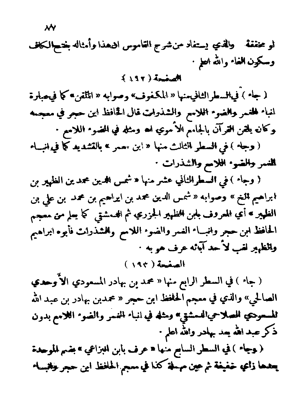 (وجاء) في السطر الثاني عشر منها (شمس الدين محمد بن الظهير بن ابراهيم الخ) وصوابه (شمس الدين محمد بن ابراهيم بن محمد بن علي بن