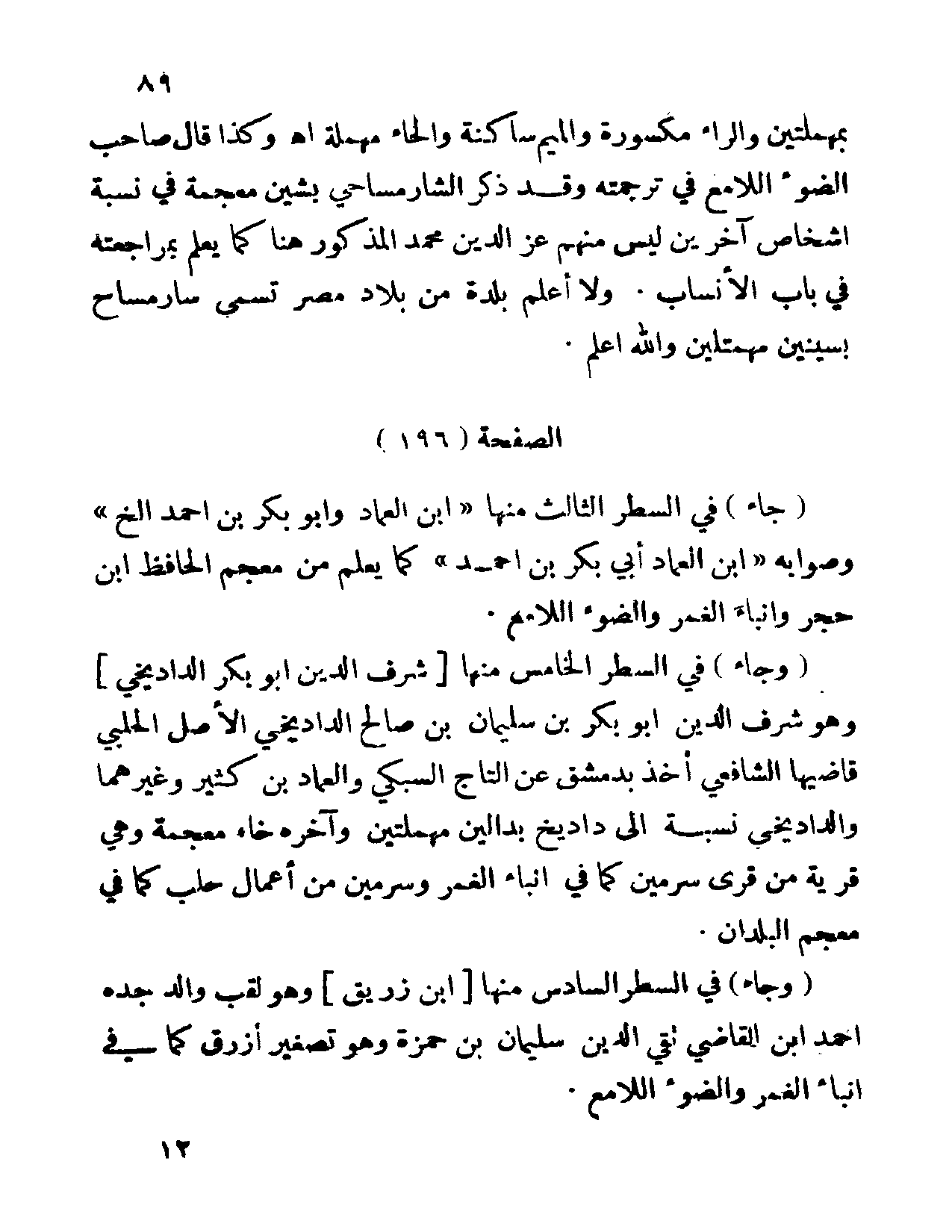(جاء) في السطر الثالث منها (ابن العماد وابو بكر بن احمد الخ) وصوابه (ابن العماد أبي بكر بن احمد) كما يعلم من معجم الحافظ ابن حجر وانباء الغمر والضوء اللامع.