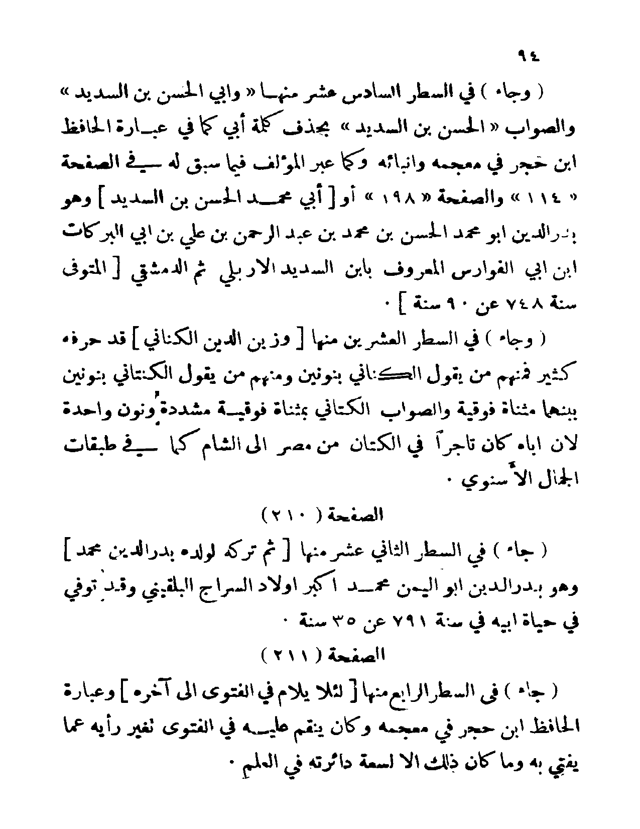 (وجاء) في السطر السادس عشر منها (وابي الحسن بن السديد) وللصواب (الحسن بن السديد) بحذف كلمة أبي كما في عبارة الحافظ ابن حجر في معجمه وانبائه وكما عبر المؤلف فيما سبق له في الصفحة (114) والصفحة (198)