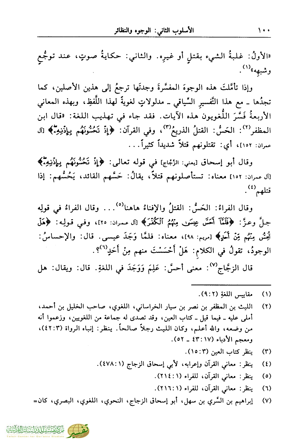 وإذا تأمَّلتَ هذه الوجوهَ المفسَّرةَ وجدتَها ترجعُ إلى هذين الأصلين، كما تجدُها ـ مع هذا التَّفسيرِ السِّياقي ـ مدلولاتٍ لغويةً لهذا اللَّفظِ، وبهذه المعاني الأربعةُ فَسَّرَ اللُّغويون هذه الآيات. فقد جاء في تهذيب اللغة: «قال ابن المظفر (¬2): الحَسُّ: القتلُ الذريعُ (¬3)، وفي القرآن: {إِذْ تَحُسُّونَهُمْ بِإِذْنِهِ} [آل عمران: 152]، أي: تقتلونهم قتلاً شديداً كثيراً ...