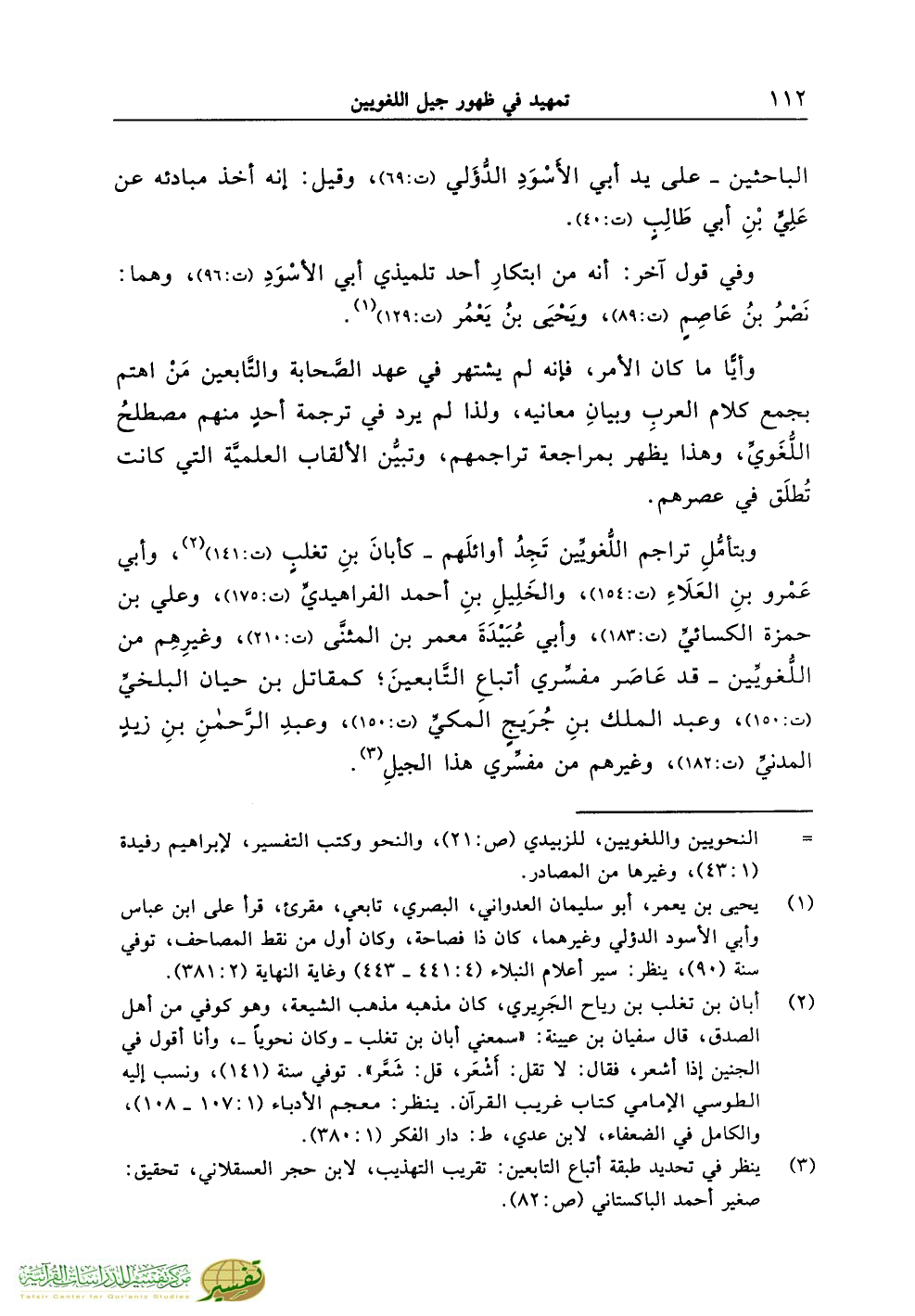 وبتأمُّلِ تراجم اللُّغويِّين تَجِدُ أوائلَهم ـ كأبانَ بنِ تغلبٍ (ت:141) (¬2)، وأبي عَمْرو بنِ العَلاَءِ (ت:154)، والخَلِيلِ بنِ أحمد الفراهيديِّ (ت:175)، وعلي بن حمزة الكسائيِّ (ت:183)، وأبي عُبَيْدَةَ معمر بن المثنَّى (ت:210)، وغيرِهِم من اللُّغويِّين ـ قد عَاصَر مفسِّري أتباعِ التَّابعينَ؛ كمقاتل بن حيان البلخيِّ (ت:150)، وعبد الملك بنِ جُرَيجٍ المكيِّ (ت:150)، وعبدِ الرَّحمنِ بنِ زيدٍ المدنيِّ (ت:182)، وغيرهم من مفسِّري هذا الجيلِ (¬3).