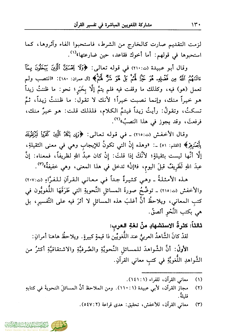 هذه الأمثلةُ ـ وهي كثيرةٌ جداً في معاني القرآنِ للفرَّاءِ (ت:207) والأخفش (ت:215) ـ توضِّحُ صورةَ المسائلِ النَّحويةِ التي طَرَقَهَا اللُّغويُّون في كتبِ المعاني، ويلاحظُ أنَّ أغلبَ هذه المسائلِ لا أثرَ فيه على التَّفسيرِ، بل هي بكتب النَّحْوِ ألصقُ.