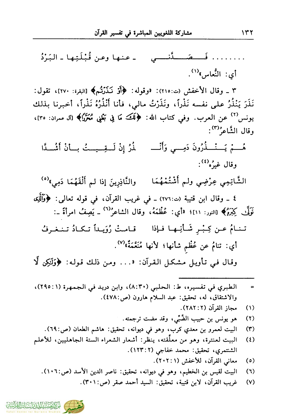 3 - وقال الأخفش (ت:215): «وقوله: {أَوْ نَذَرْتُمْ} [البقرة: 270]، تقول: نَذَرَ يَنْذُرُ على نفسه نَذْراً، ونَذَرْتُ مالي، فأنا أَنْذُرُهُ نَذْراً، أخبرنا بذلك يونس (¬2) عن العرب. وفي كتاب الله: {لَكَ مَا فِي بَطْنِي مُحَرَّرًا} [آل عمران: 35]، وقال الشَّاعرُ (¬3):