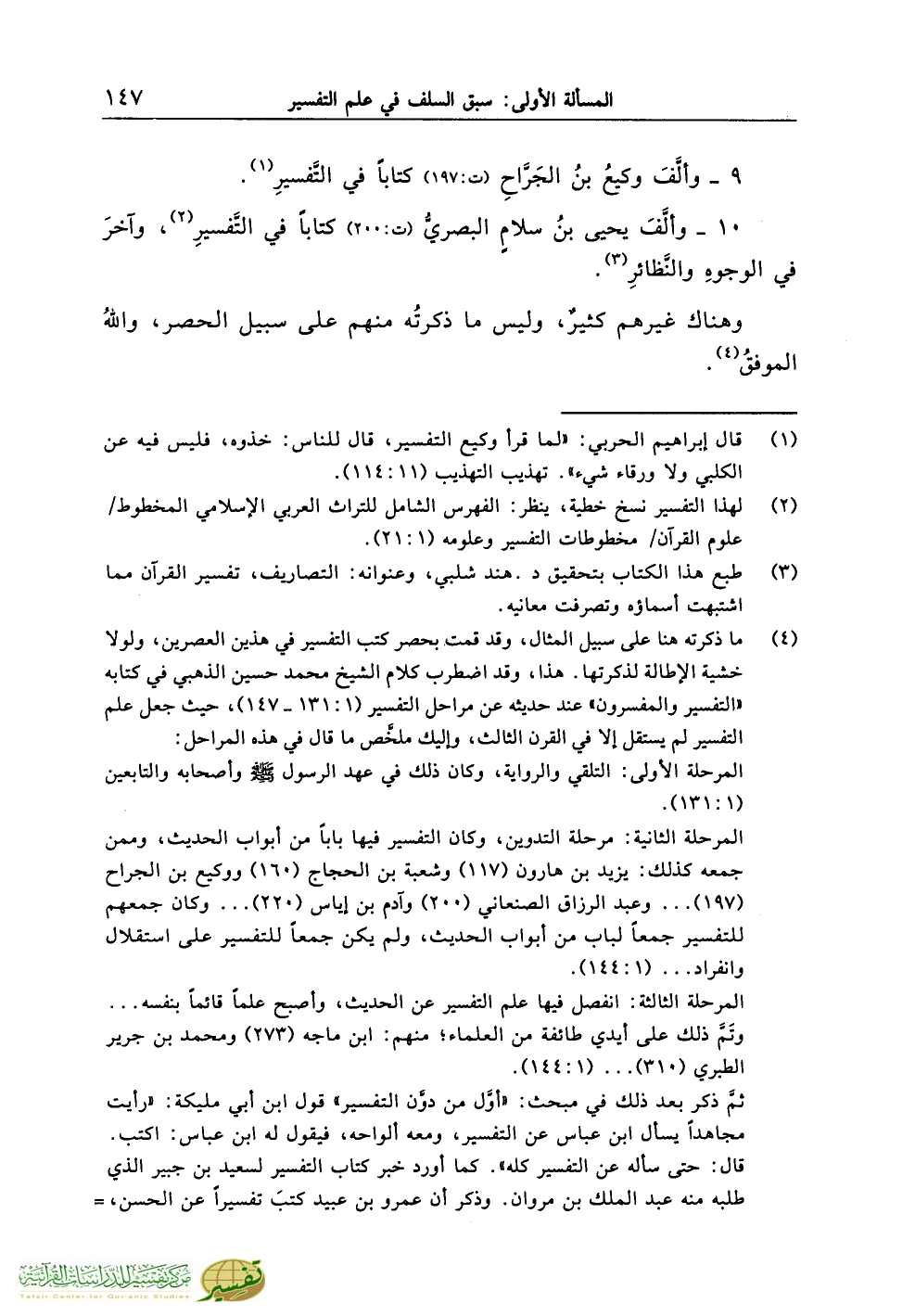 (¬4) ما ذكرته هنا على سبيل المثال، وقد قمت بحصر كتب التفسير في هذين العصرين، ولولا خشية الإطالة لذكرتها. هذا، وقد اضطرب كلام الشيخ محمد حسين الذهبي في كتابه «التفسير والمفسرون» عند حديثه عن مراحل التفسير (1:131 - 147)، حيث جعل علم التفسير لم يستقل إلا في القرن الثالث، وإليك ملخَّص ما قال في هذه المراحل: