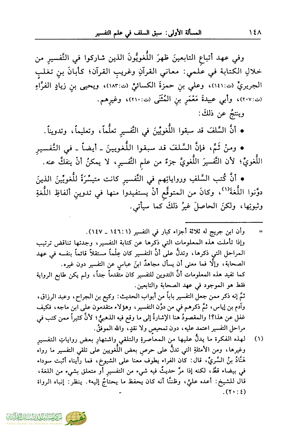 * أنَّ السَّلفَ قد سبقوا اللُّغويِّينَ في التَّفسيرِ تعلُّماً، وتعليماً، وتدويناً.
