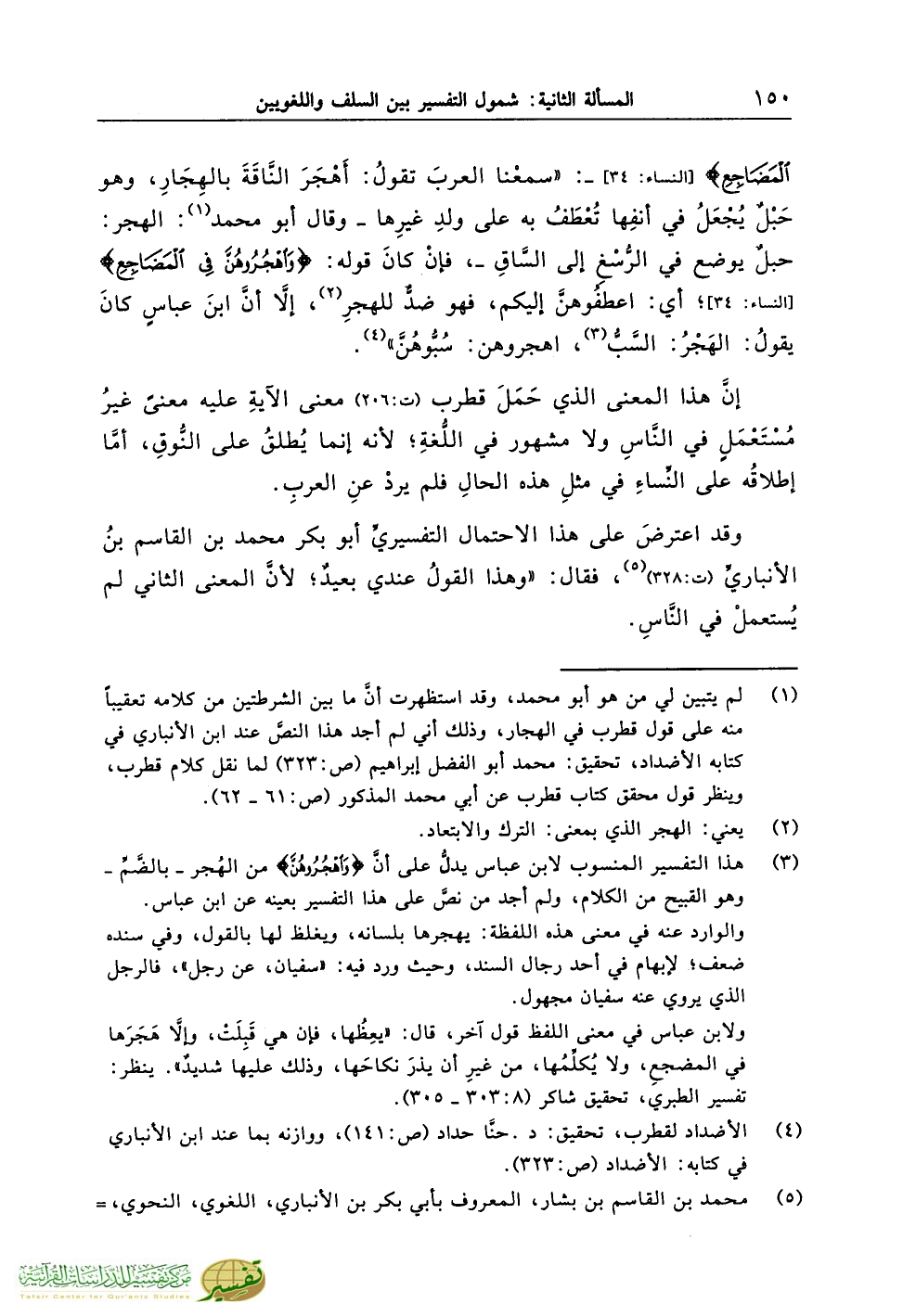وقد اعترضَ على هذا الاحتمال التفسيريِّ أبو بكر محمد بن القاسم بنُ الأنباريِّ (ت:328) (¬5)، فقال: «وهذا القولُ عندي بعيدٌ؛ لأنَّ المعنى الثاني لم يُستعملْ في النَّاسِ.