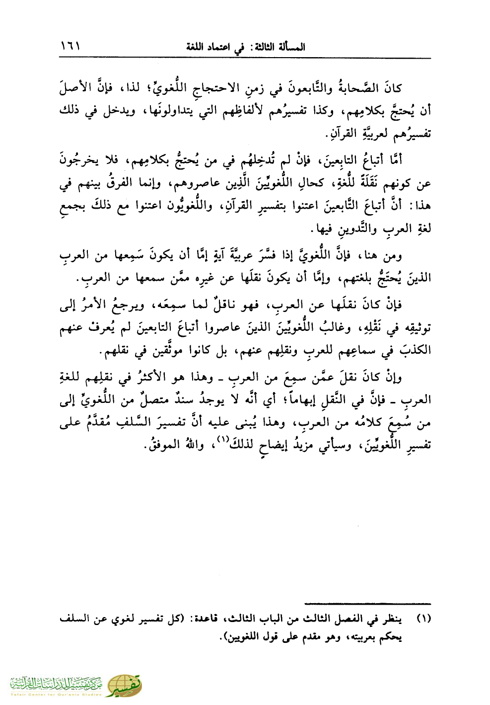 (¬1) ينظر في الفصل الثالث من الباب الثالث، قاعدة: (كل تفسير لغوي عن السلف يحكم بعربيته، وهو مقدم على قول اللغويين).