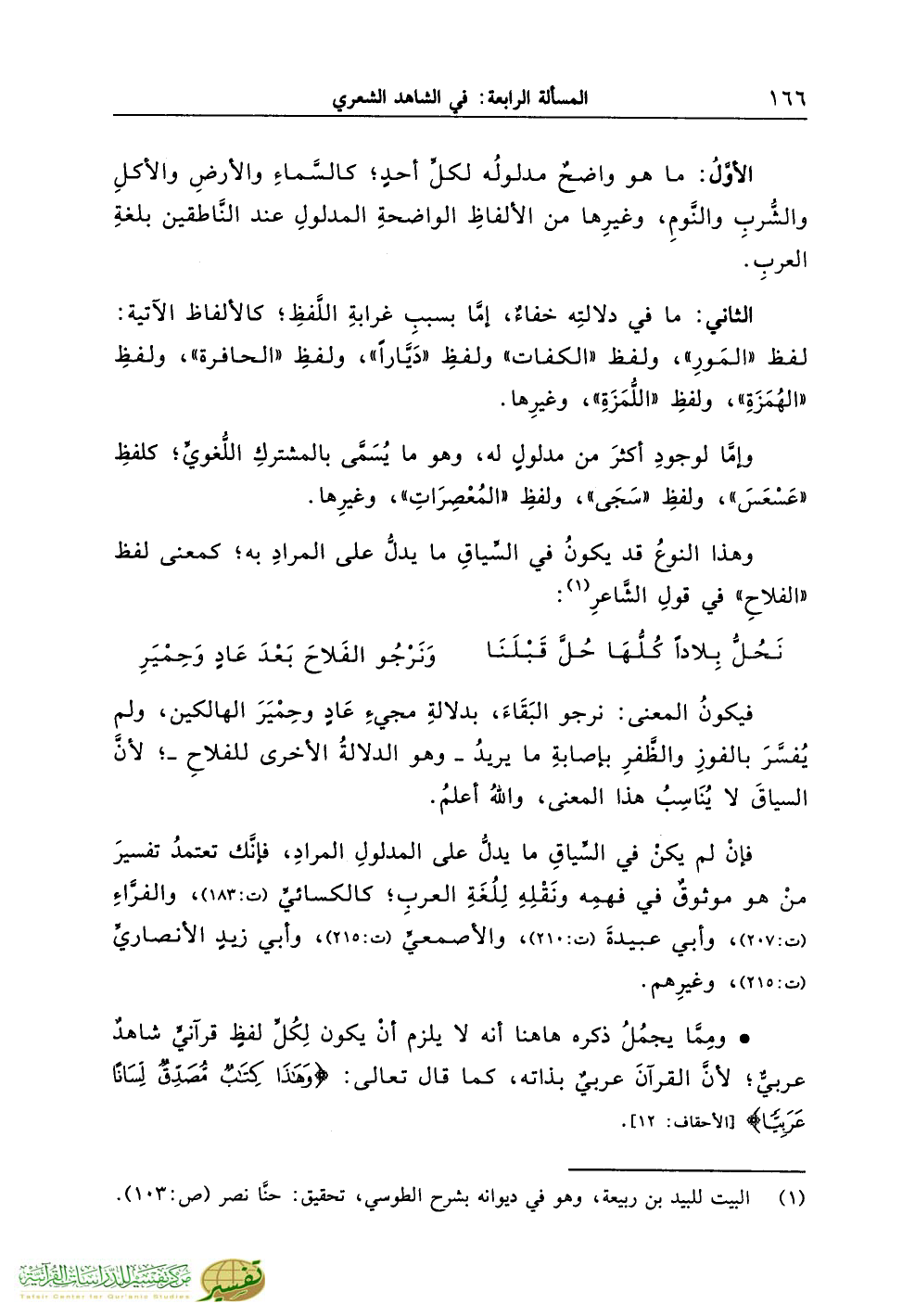 * ومِمَّا يجمُلُ ذكره هاهنا أنه لا يلزم أنْ يكون لِكُلِّ لفظٍ قرآنيٍّ شاهدٌ عربيٌّ؛ لأنَّ القرآنَ عربيٌ بذاته، كما قال تعالى: {وَهَذَا كِتَابٌ مُصَدِّقٌ لِسَاناً عَرَبِيًّا} [الأحقاف: 12].