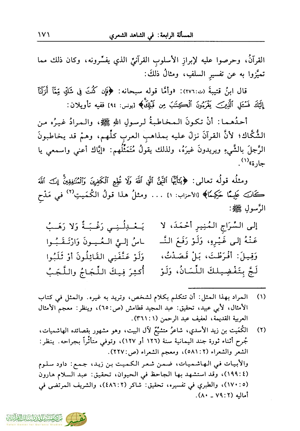 ومثلُه قولُه تعالى: {يَاأَيُّهَا النَّبِيُّ اتَّقِ اللَّهَ وَلاَ تُطِعِ الْكَافِرِينَ وَالْمُنَافِقِينَ إِنَّ اللَّهَ كَانَ عَلِيمًا حَكِيمًا} [الأحزاب: 1] ... ومثلُ هذا قولُ الكُمَيتِ (¬2) في مَدْحِ الرَّسولِ صلّى الله عليه وسلّم: